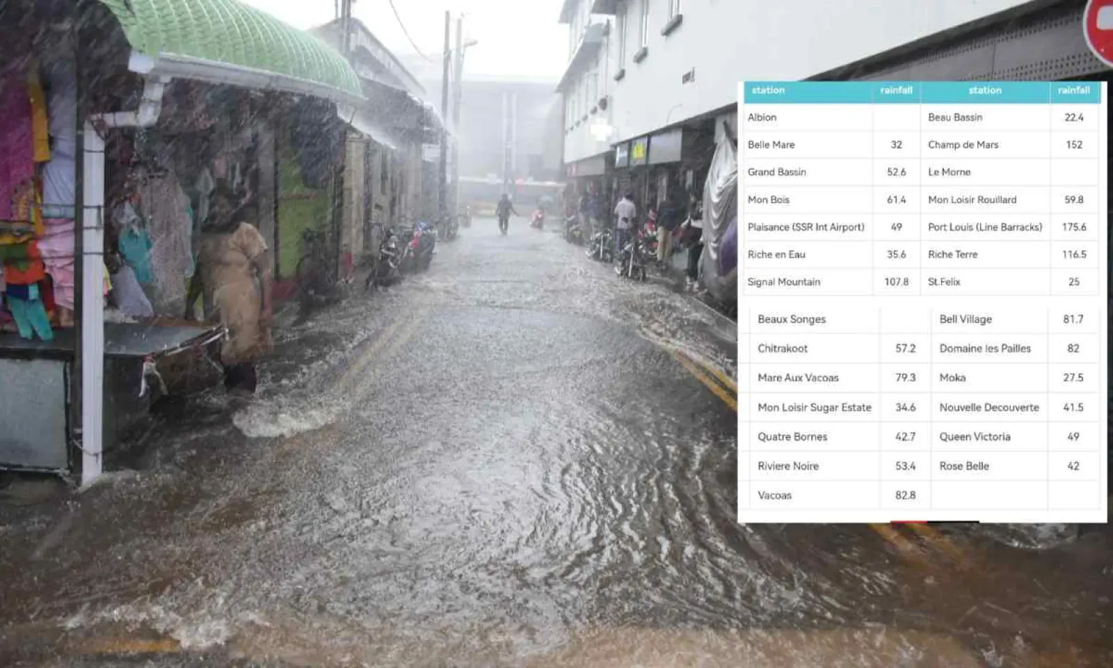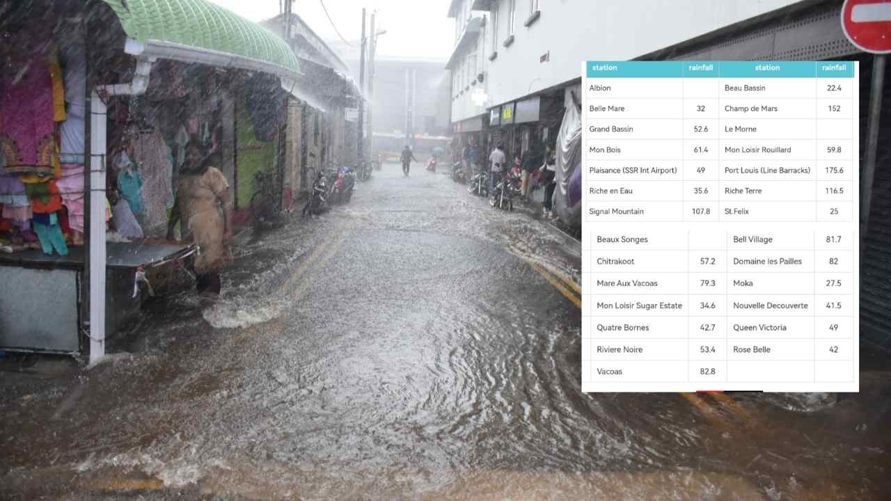Vous avez bien lu, 175,6 mm ! C’est la pluviométrie enregistrée dans la capitale en seulement 24 heures, jusqu’à 19 h ce lundi. Les chiffres sont tout aussi impressionnants dans les autres régions, avec 152 mm de pluie à Champ-de-Mars et 116,5 mm à Riche-Terre. Un avis de pluies torrentielles a été émis par le service météo cet après-midi. Avis qui a été levé en fin d’après-midi. Une alerte de veille de fortes a été émise. Elle est valable jusqu’à 04 h 30 ce mardi matin. .
