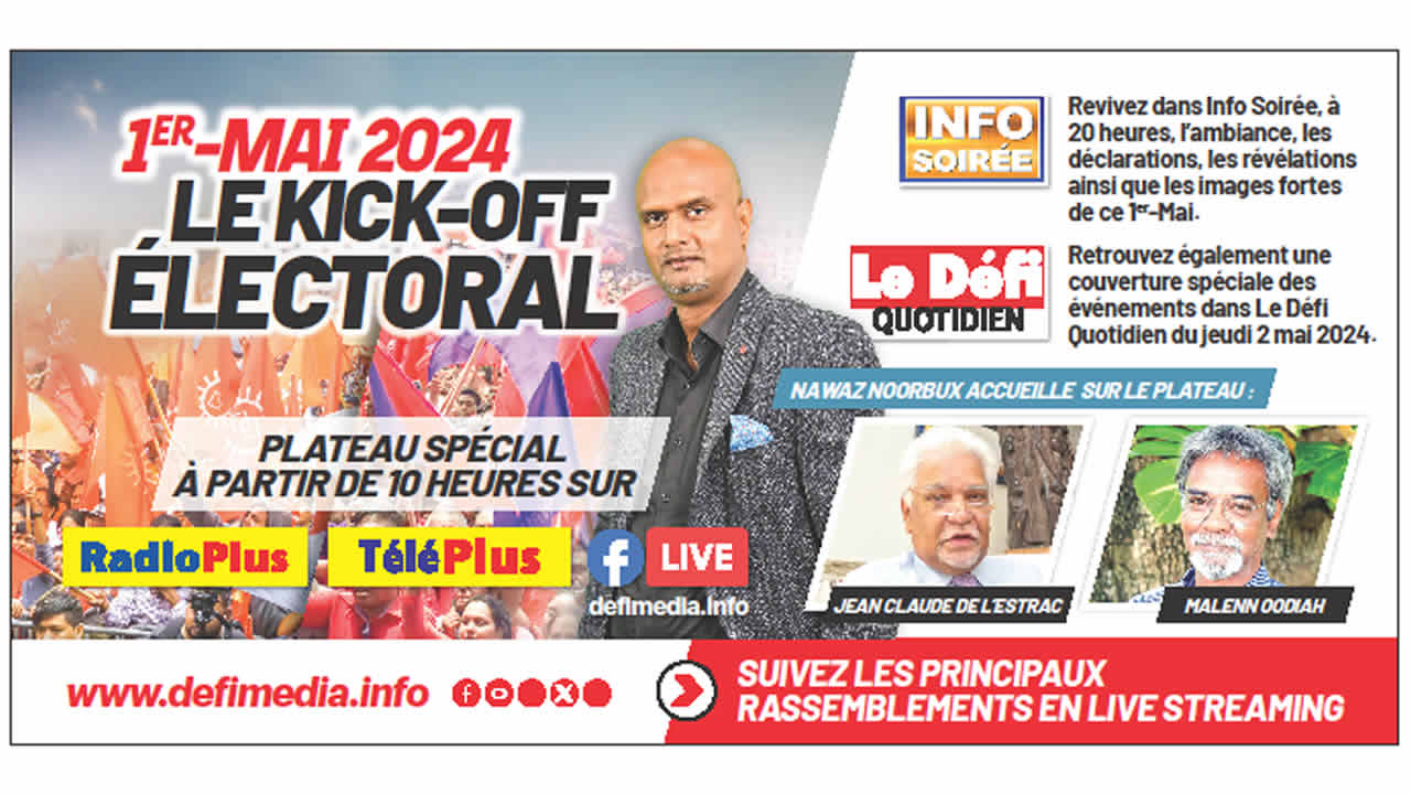 Suivez ces rassemblements politiques en LIVE sur nos différentes plateformes. Nawaz Noorbux animera un plateau spécial, ce mercredi à partir de 10 heures, avec deux observateurs : Jean Claude de l'Estrac et Malenn Oodiah. Nous vous proposerons l'intégralité des discours des principaux dirigeants de l'alliance MSM/Linite Militan/ML et ceux de l'alliance PTr/MMM/Nouveaux