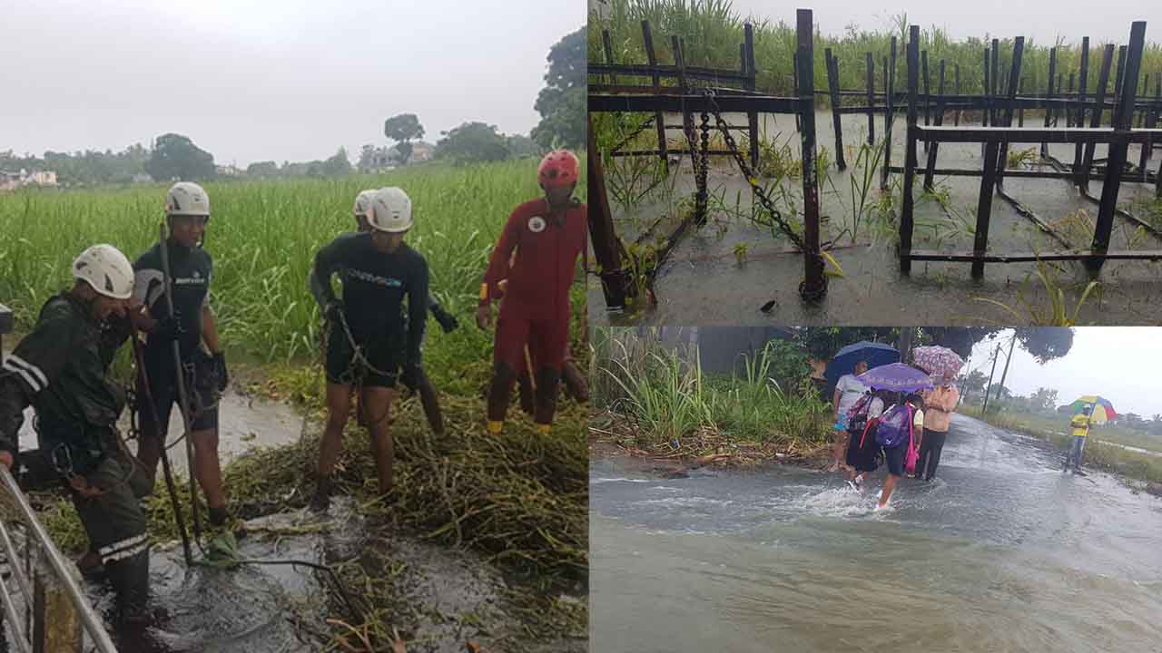 «Nos officiers ont effectué une dizaine d’interventions. Les équipes de Coromandel et de Mahébourg ont prêté main-forte à leurs collègues de Saint-Aubin. Nos pompiers ont effectué plus d’une dizaine d’interventions à Riche-Mare, Flacq et Bel-Air/Rivière-Sèche. Une équipe spécialisée est actuellement à Riche-Mare car il y a une grande accumulation d’eau. Une rivière en crue menace des maisons. On doit retirer les algues qui bouchent le pont », explique Dorsamy Ayacouty.