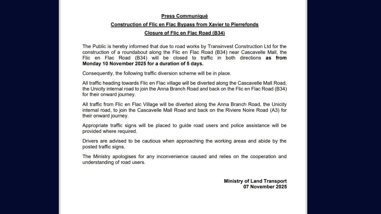 Live News Travaux routiers à Flic-en-Flac : fermeture temporaire de la route B34 à partir du 10 novembre