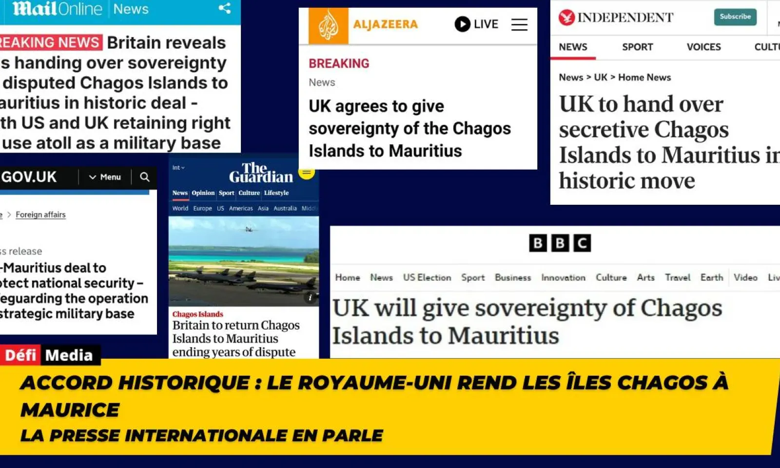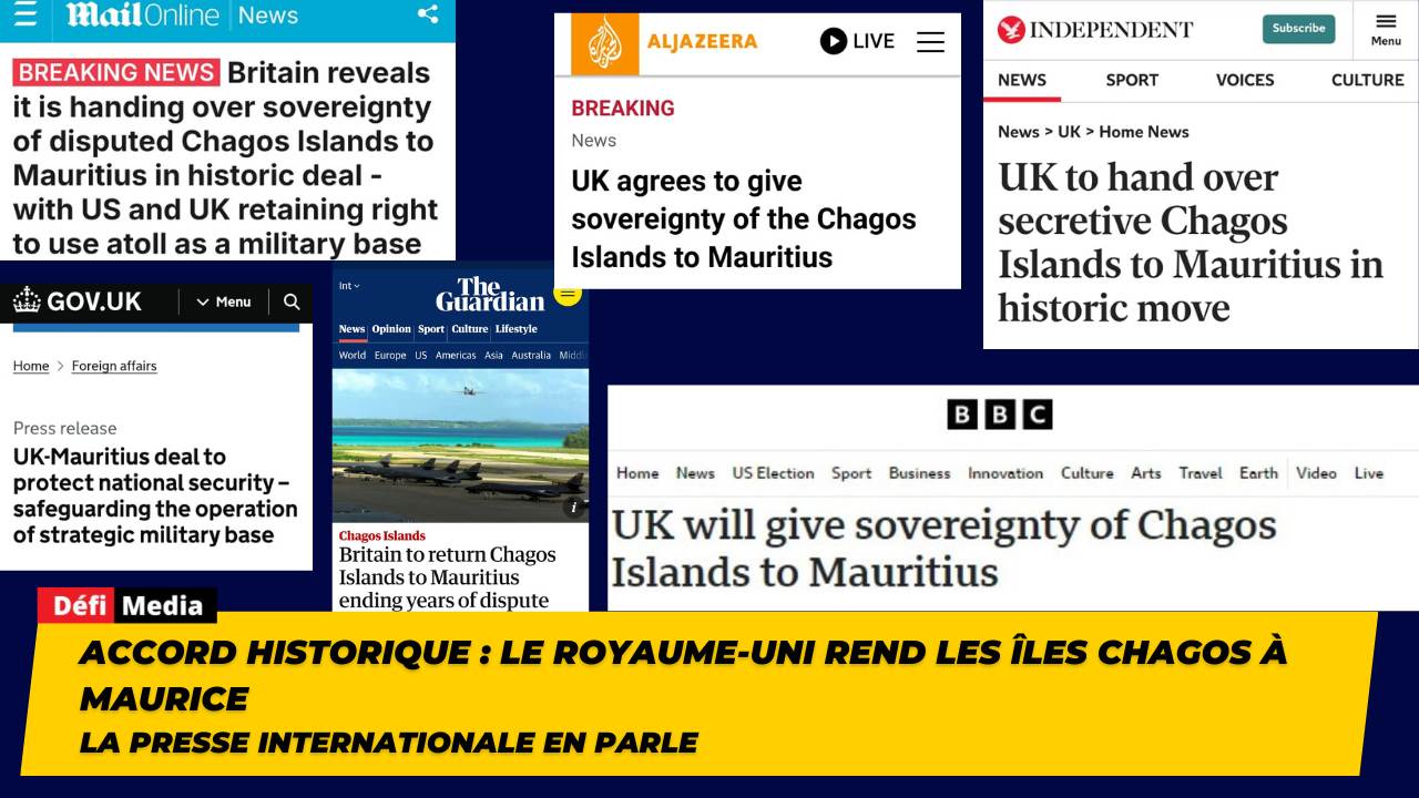 BBC, Al Jazeera, The Guardian, Independent, Mail Online... L'accord historique entre le Royaume-Uni et Maurice concernant les Chagos fait la une de la presse internationale ce jeudi. Le Royaume-Uni a accepté de restituer la souveraineté des îles Chagos à Maurice.