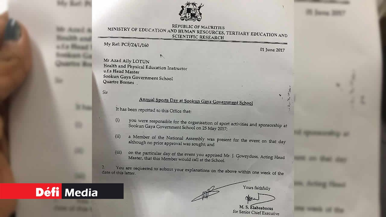 Ce Quatrebornais est Health and Physical Educator pour les écoles primaires d’État de la région de Quatre-Bornes. Son école avait organisé une journée sportive annuelle, le 25 mai dernier. Le directeur et les membres de la PTA avaient sollicité la générosité des élus du Parlement pour sponsoriser la journée. Azad Ally Lotun allègue avoir été sanctionné pour cela.