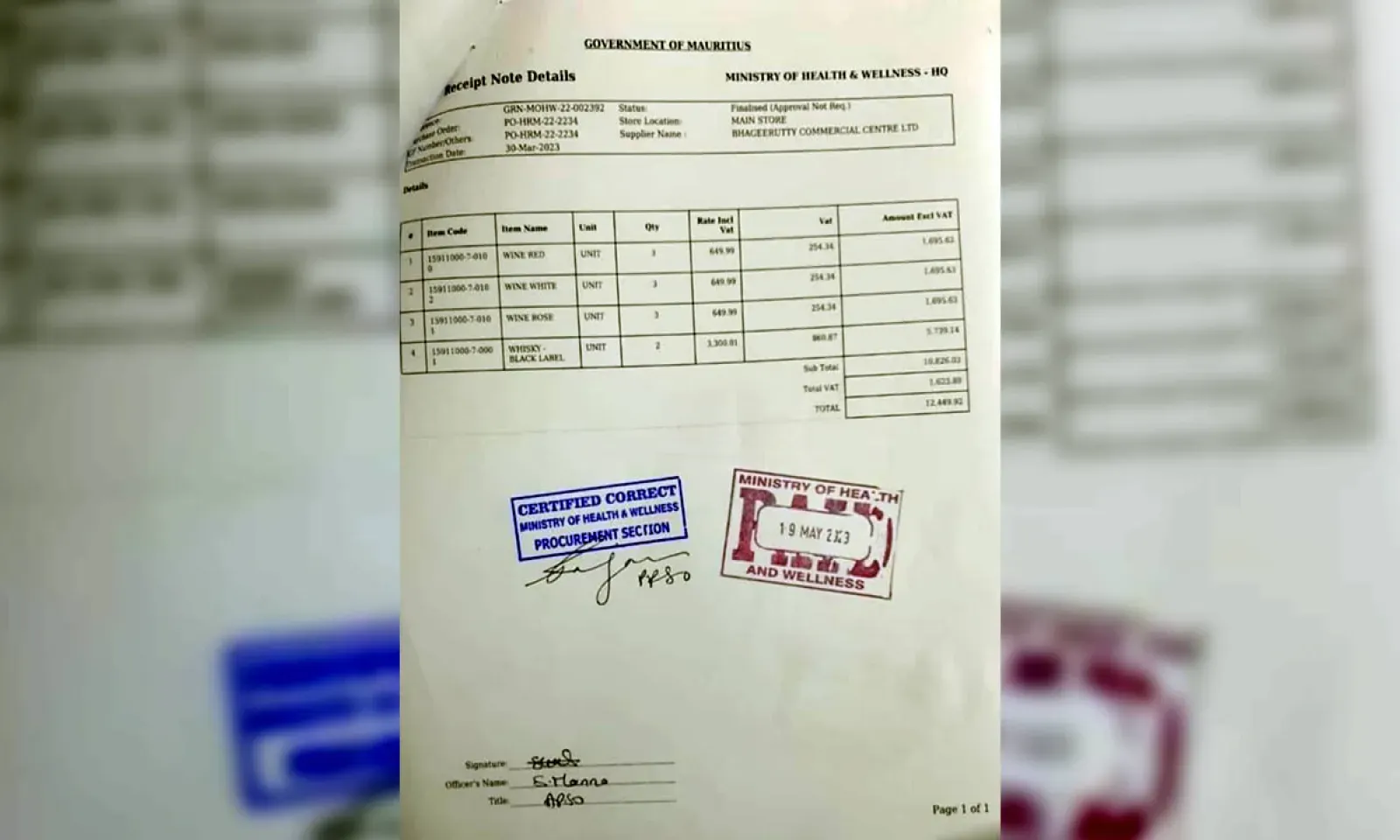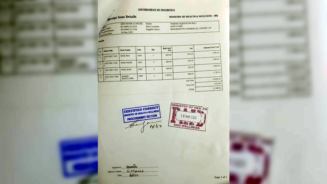 À la source de la colère ministérielle se trouve un document brandi par le député rouge, vendredi lors du meeting. Ce document officiel, en provenance du ministère de la Santé, indique que ce dernier a passé commande auprès de Bhageerutty Commercial Centre Ltd pour neuf bouteilles de vin rouge et trois bouteilles de whisky Black Label pour un total de Rs 12 449,92. La date de la transaction est le 30 mars 2023. Le ministère de la Santé a procédé au paiement le 19 mai.