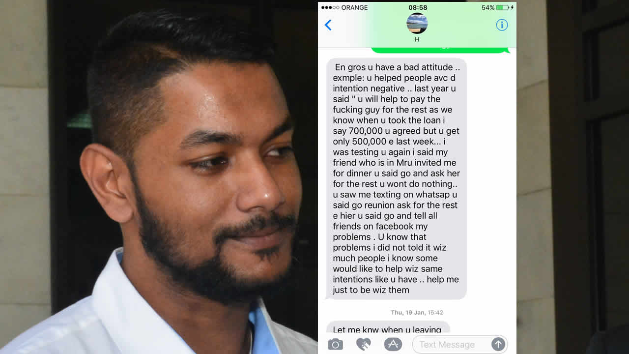 D’autres messages font état des pourparlers avec Ravi Yerrigadoo afin en vue d’obtenir une levée de l’interdiction de quitter le territoire à cause de son inculpation pour escroquerie. « Minis va perdi konfians e Sylvio osi wiz me », lui écrit-il. Il impute également à son ex-petite amie ses déboires, tel le risque d’une inculpation si elle ne lui avance pas de l’argent. Pour elle, c’est clair, il la traitait comme une tirelire.