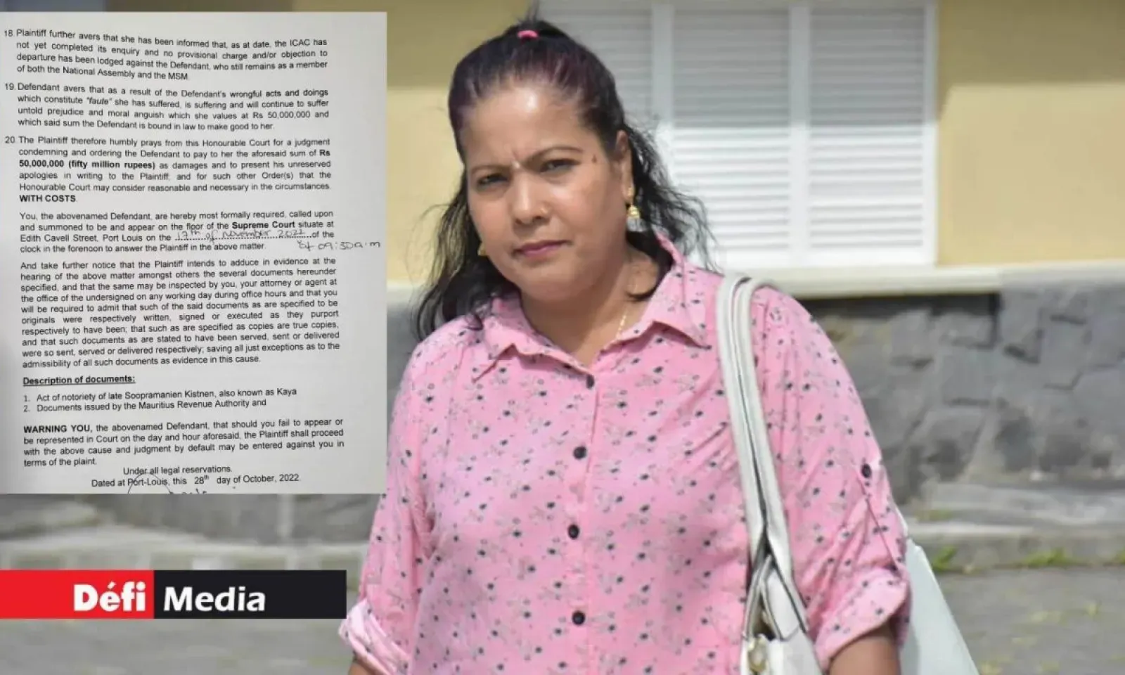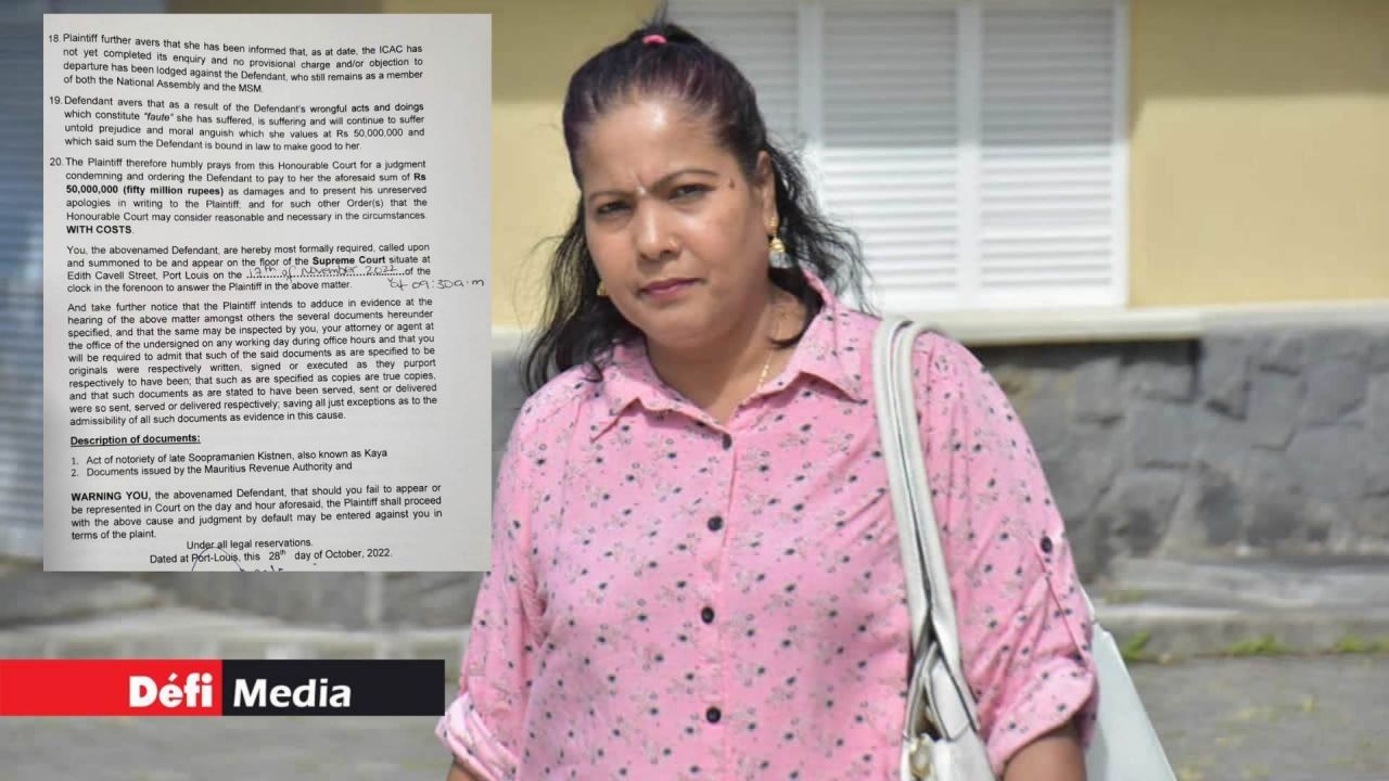 La veuve de Soopramanien Kistnen contre-attaque. Dans une plainte déposée en Cour suprême ce vendredi 28 octobre, Simla Kistnen réclame des dommages de Rs 50 millions à l’ex-ministre du Commerce et député du MSM, Yogida Sawmynaden, dans le cadre de l’affaire « Constituency Clerk ». L’affaire sera appelée le 17 novembre.