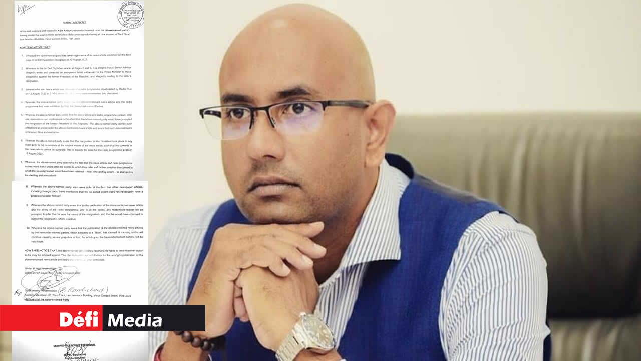 Ken Arian, ancien Senior Advisor au Bureau du Premier ministre et actuel président d’Airport Holdings Ltd (AHL), soutient que la publication de l’article intitulé « Un ex-Senior Advisor a-t-il écrit une lettre anonyme au PM pour faire partir la présidente ? » dans Le Défi Quotidien du 12 août lui cause des préjudices. Il en va de même pour un « radio programme » diffusé le même jour à 7 h 04 sur Radio Plus, « où les allégations ont été commentées et discutées ».