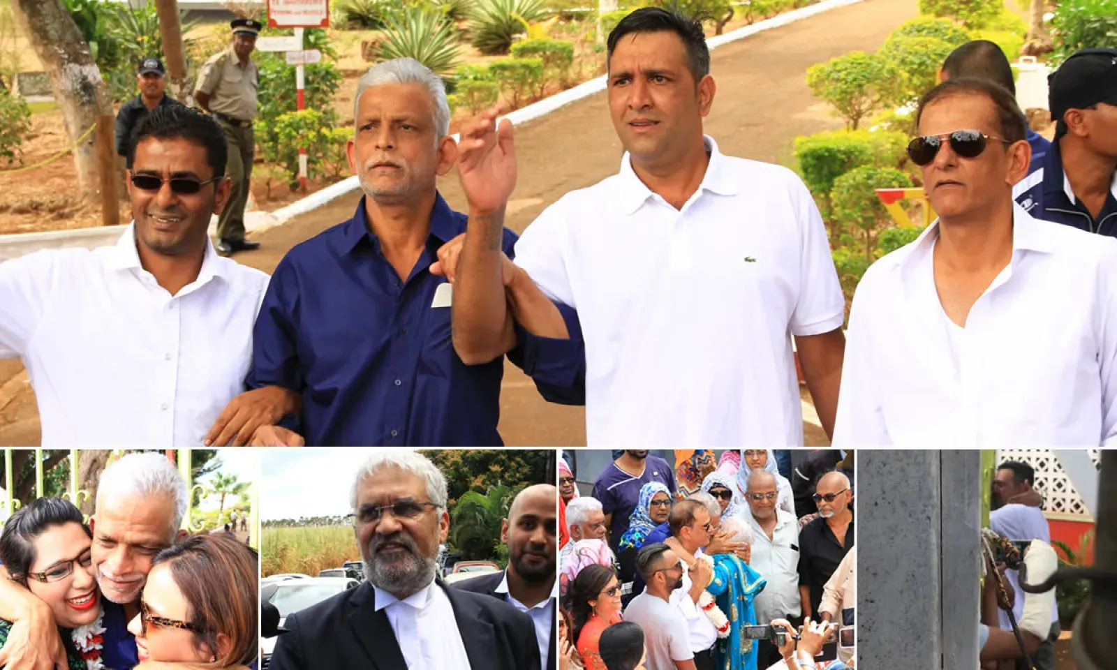 C’est à 13h12, que Khaliloudeen Sumodhee, dit Khalil, Sheikh Imran Sumodhee, Shafick Nawoor, alias Fico et Naseeb Keramuth ont fait leurs premiers pas à l’extérieur de la prison. Tous de foi musulmane, ils se sont prosternés hors de la prison, en hommes libres sous les regards de la foule. Ils ne cessent de clamer leur innocence. Après les premières accolades et les larmes, les quatre ex-prisonniers ont reçu des guirlandes de fleurs.