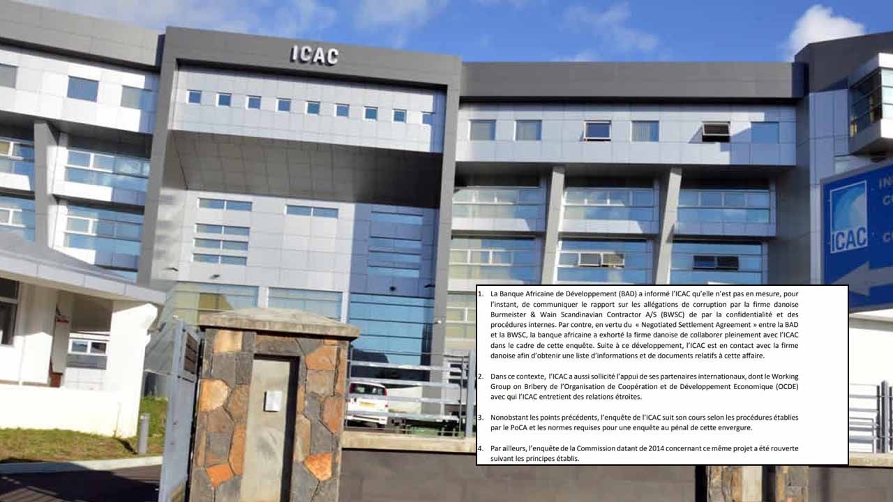 « La Banque Africaine de Développement (BAD) a informé l’ICAC qu’elle n’est pas en mesure, pour l’instant, de communiquer le rapport sur les allégations de corruption par la firme danoise Burmeister & Wain Scandinavian Contractor A/S (BWSC) de par la confidentialité et des procédures internes. Par contre, en vertu du 'Negotiated Settlement Agreement' entre la BAD et la BWSC, la banque africaine a exhorté la firme danoise de collaborer pleinement avec l’Icac dans le cadre de cette enquête. Suite à ce développement, l’Icac est en contact avec la firme danoise afin d’obtenir une liste d’informations et de documents relatifs à cette affaire », indique-t-on dans le communiqué.