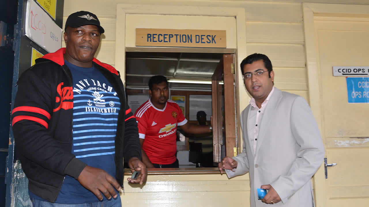 Steven St Pierre, assisté de son avocat Me Anupam Khandai, est entendu par les enquêteurs du Central CID.