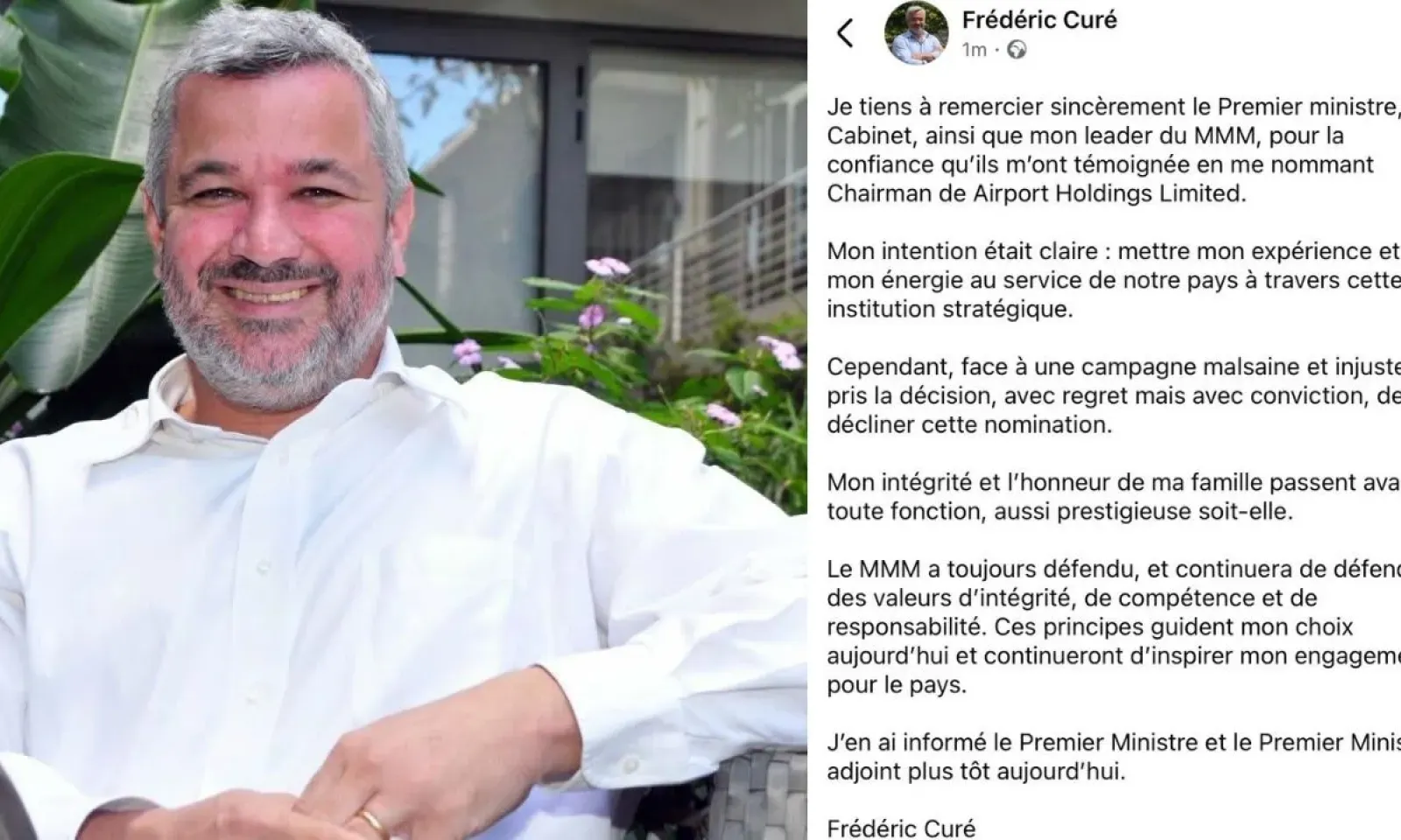Frédéric Curé a annoncé, ce samedi 16 août en début de soirée sur sa page Facebook, qu’il a décliné sa nomination en tant que Chairman de l’Airport Holdings Limited (AHL). Il précise avoir également informé de sa décision le Premier ministre, Navin Ramgoolam, ainsi que le Premier ministre adjoint, Paul Bérenger, plus tôt dans la journée.