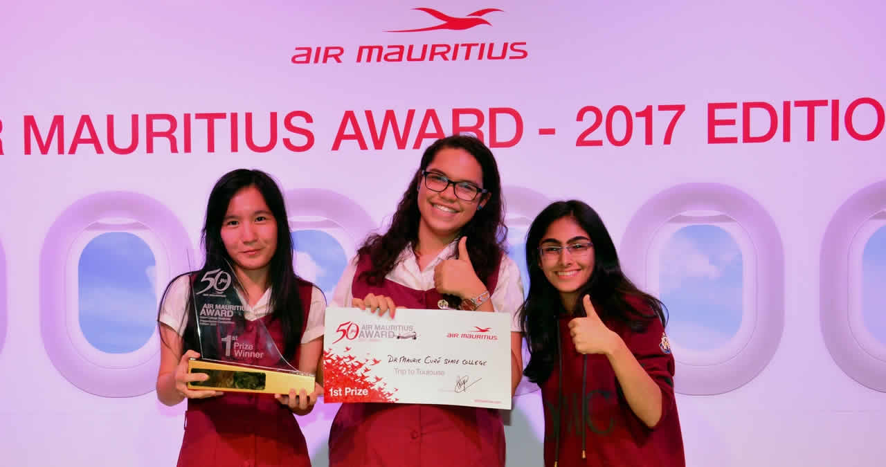 C’est le Dr Maurice Curé State College, représenté par Annaëlle Li Pin Liung, Marie Laëtitia Desales, et Sharmeen Salehmohamed, qui a remporté la finale du Air Mauritius Award 2017. L’équipe gagnante s’envolera pour Toulouse (France) où elle aura l’opportunité de visiter la ligne d’assemblage de l’Airbus A350 XWB.