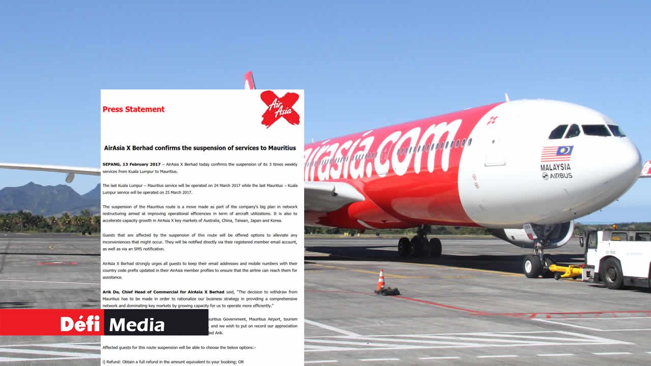 « AirAsia X Berhad today confirms the suspension of its 3 times weekly services from Kuala Lumpur to Mauritius. The last Kuala Lumpur-Mauritius service will be operated on 24 March while the last Mauritius-Kuala Lumpur service will be operated on 25 March 2017», annonce la maison-mère dans son communiqué.