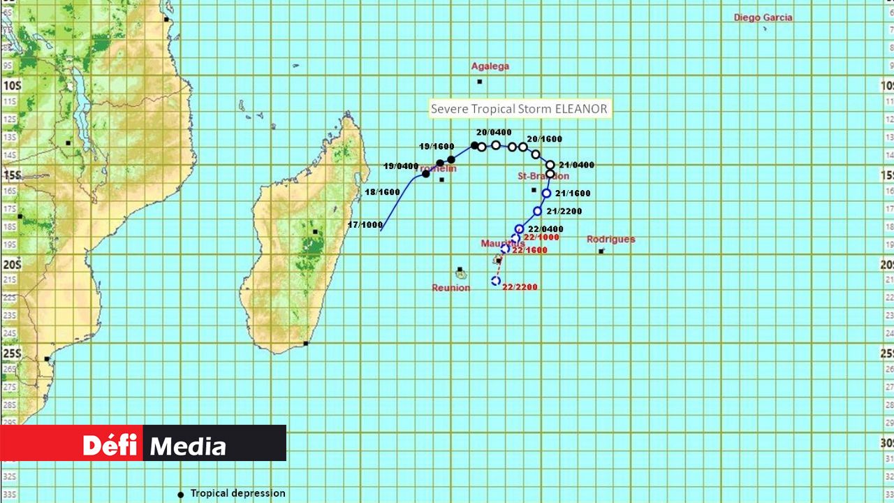 À 04 h 00, la forte tempête tropicale Eleanor était centrée à environ 200 km au nord-est de Maurice, soit autour du point 18.6 degrés sud en latitude et 58.8 degrés est en longitude. Eleanor se déplace dans une direction générale du sud-sud-ouest à une vitesse de 20 km/h. Sur cette trajectoire, Eleanor s'approche dangereusement de Maurice et représente une menace directe pour l'île, selon la station météo de Vacoas. Le rayon de vents forts pourrait traverser l'est de l'île vers la mi-journée. Il est aussi prévu qu’Eleanor passe près de la côte Est cet après-midi.