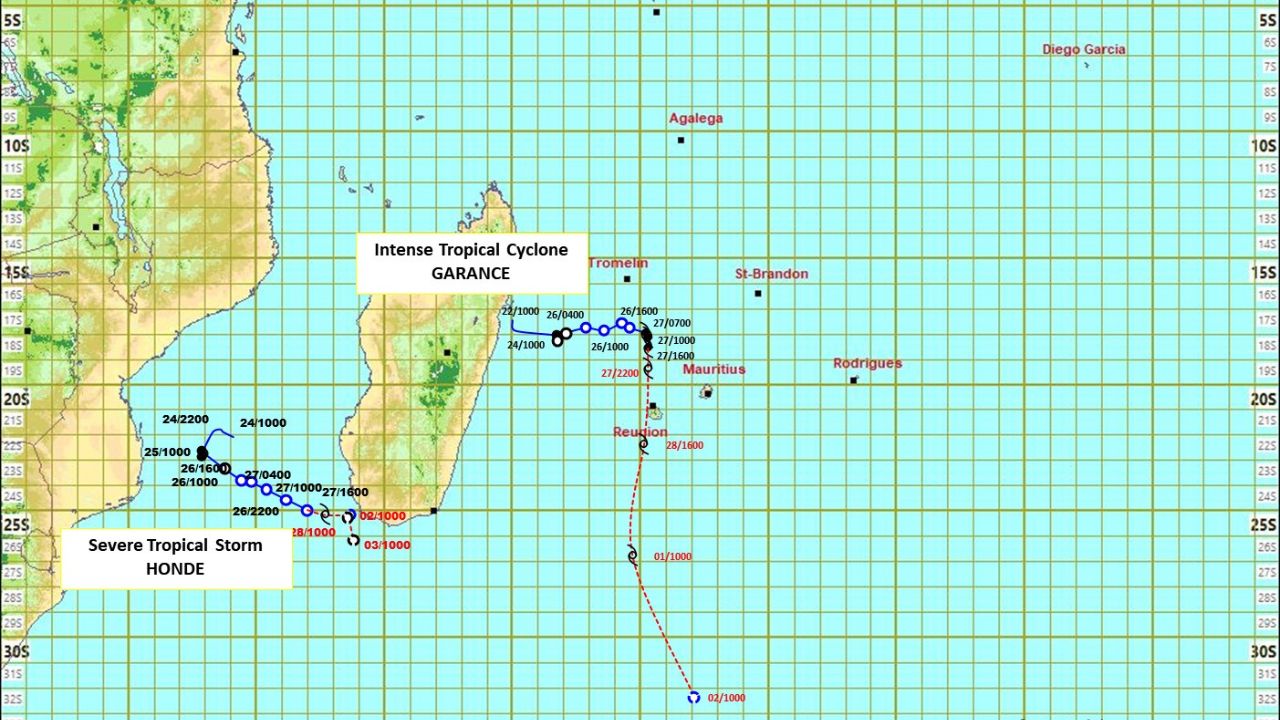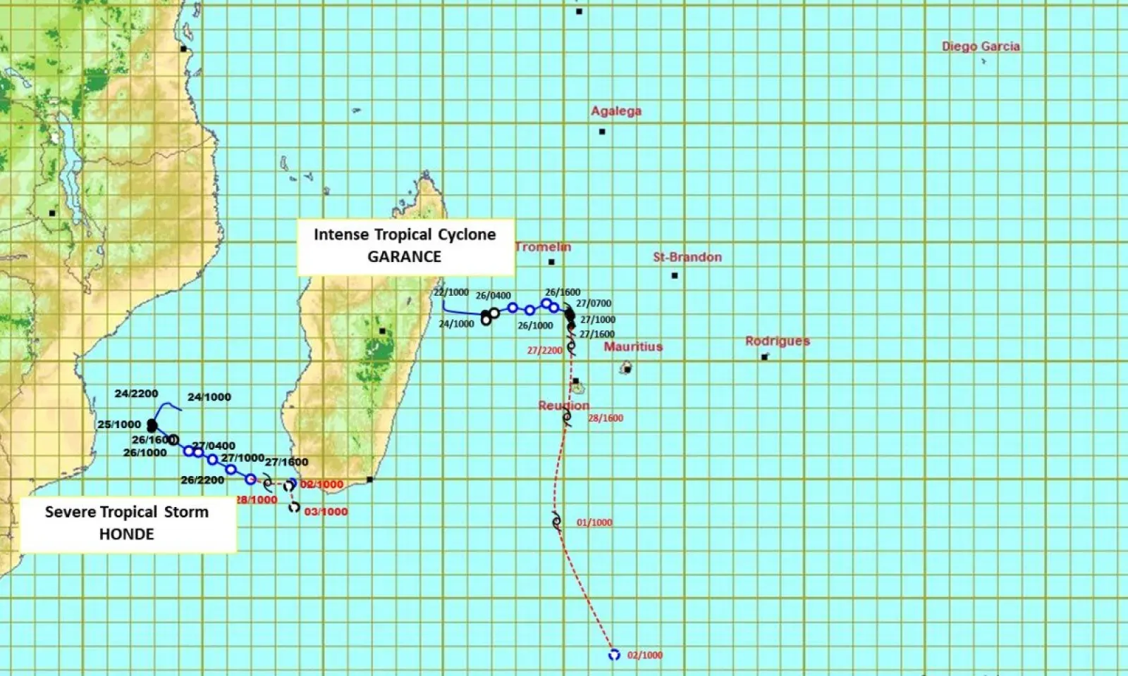 À 16 heures, Garance était centrée à environ 275 km au nord-ouest de Maurice, soit en latitude 18.6 degrés sud et longitude 55.3 degrés est. Au cours des dernières heures, il se déplace vers le sud à une vitesse de 8 km/h.