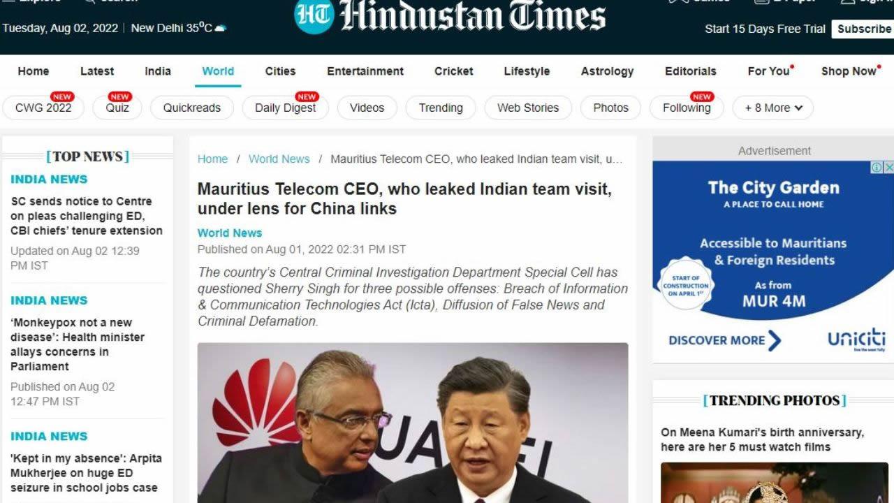 Par ailleurs, le « Hindustan Times » parle aussi de scandale. Le lien présumé entre la société technologique chinoise Huawei et l'ancien CEO de Mauritius Telecom pourrait avoir un gros impact sur la sécurité nationale de l'Inde : « A scandalous connection between Chinese technology company Huawei and the former CEO of Mauritius Telecom could have a huge impact on India’s national security, if not for the Mauritius Government declaring a war on Huawei which has strongly penetrated the telecommunications sector in the island nation. Rumour mills started working overtime as soon as Sherry Singh resigned as Chief Executive Officer of Mauritius’s national telecommunications company last month after heading the company for more than seven years ».