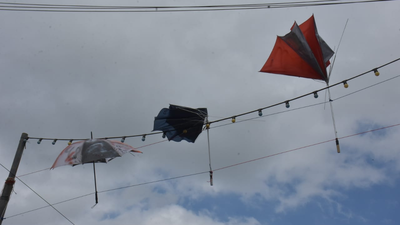 Non, ce n'est pas un essai de décoration comme on en voit parfois dans des centres commerciaux. Mais que peuvent bien faire ces trois parasols accrochés à un fil électrique destiné à l’éclairage public ?