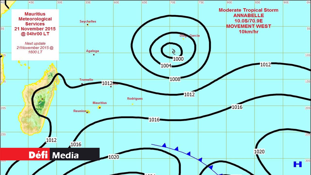 Elle a été baptisée Annabelle. La première tempête de la saison se trouvait, à 10 heures samedi 21 novembre, à environ 1 800 km au nord-est de l’île Maurice.