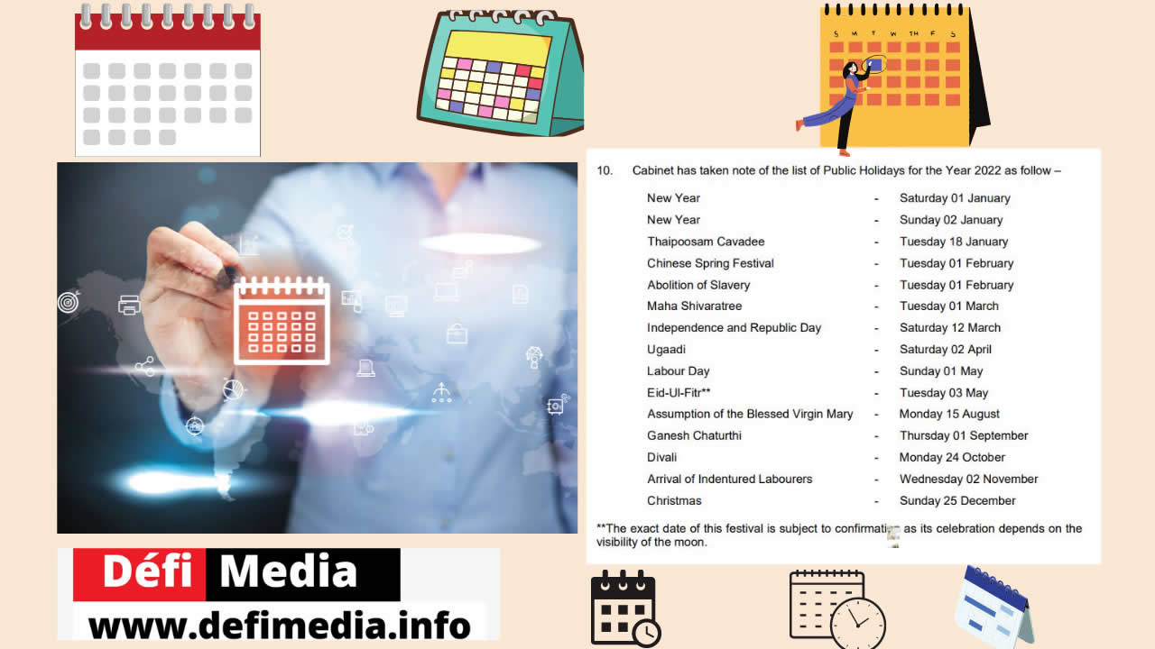 La liste des jours fériés pour l’année 2022 a été avalisée par le conseil des ministres ce vendredi 18 juin. Et six congés publics tombent durant le week-end. À savoir la célébration du Nouvel An le samedi 1er janvier et le dimanche 2 janvier. Puis, la fête de l’indépendance de Maurice le samedi 12 mars 2022. S’ensuivent la fête de l’ougadi le samedi 2 avril. Le Labour Day fête du 1er-Mai sera un dimanche. Et la Noël est prévue pour le dimanche 25 décembre 2022.