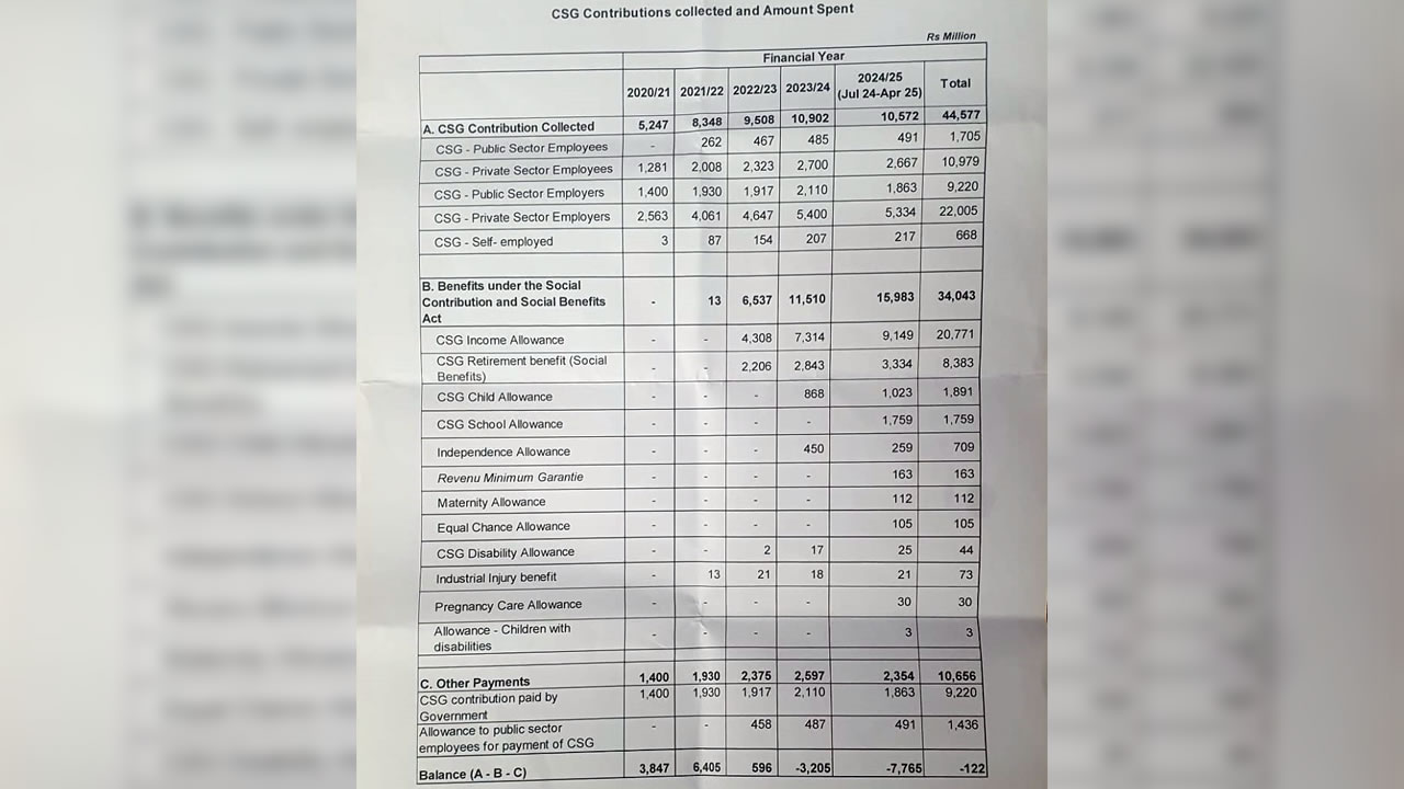 La situation semble plus grave que ce que l’on aurait pu croire. Les fonds de la contribution sociale généralisée (CSG) ont été dépensés en totalité. Et en plus, à la fin d’avril, il était dans le rouge à hauteur de Rs 122 millions. Il avait enregistré un déficit de Rs 7,77 milliards pour l’année financière 2024/25 (jusqu’au 25 avril 2025).