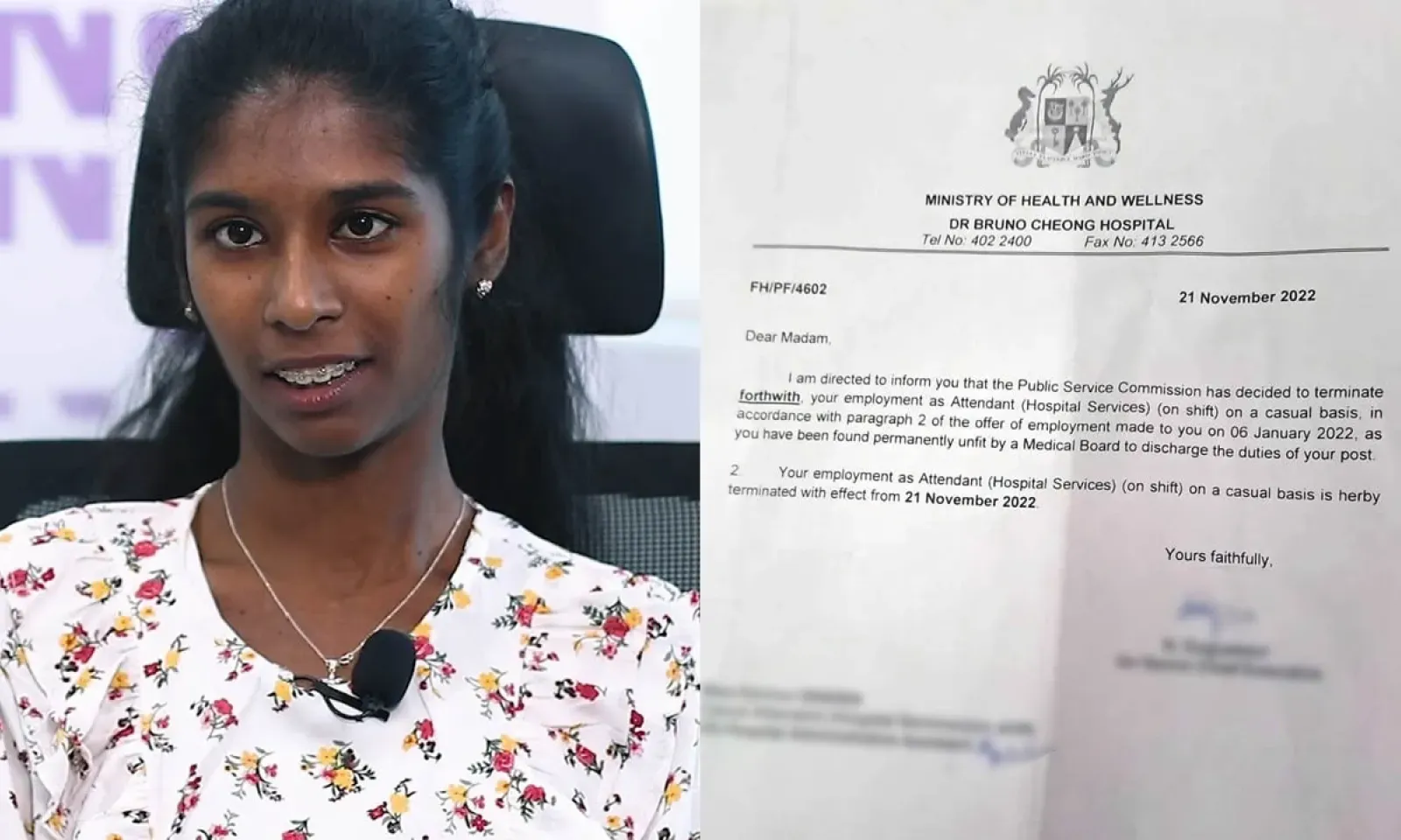 Jugée « permanently unfit » par le ministère de la Santé, Kelvina Venden (28 ans), handicapée depuis sa naissance, a récemment été licenciée de son poste d’Attendant à l’hôpital Dr Bruno Cheong, où elle a travaillé pendant plus de 10 mois.