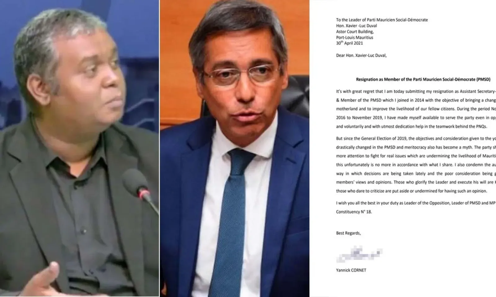 Yannick Cornet a soumis sa démission du PMSD ce vendredi, 30 avril, au leader des bleus, Xavier-Luc Duval. Il était le secrétaire-général adjoint du parti qu’il a rejoint en 2014. Il prend ses distances des bleus au lendemain de la démission du député Salim Abbas Mamode, qui siège désormais en indépendant au Parlement.