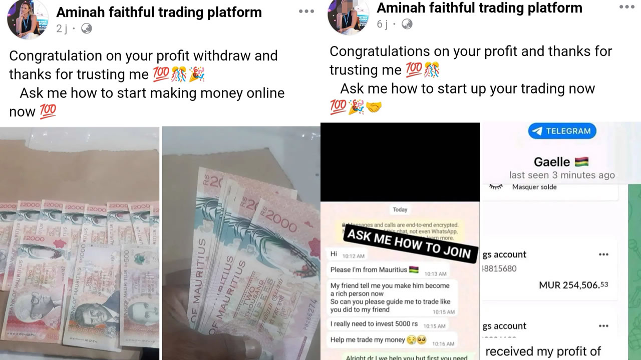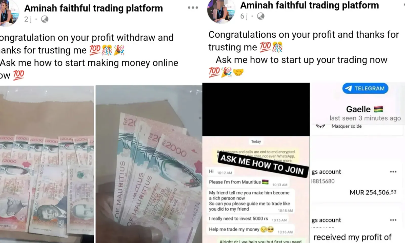 Neelam, issue d’un village de l’Ouest de l’île, commence à être séduite par les promesses d’« Aminah faithful trading platform ». Les retours sur les différents plans d’investissement sont très attractifs, promettant des bénéfices en l’espace de 24 heures. « Linn dir mwa bann lezot dimounn pe gagn kas. Linn avoy mwa bann screenshot mesaz pou konvink mwa. Monn dir mo pou sey enn kou », confie Neelam au Défi Plus.
