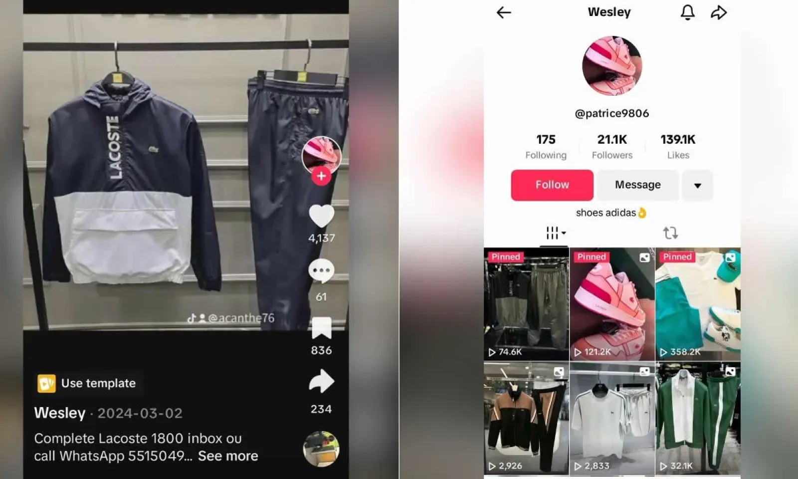 Sur TikTok, ce profil, qui vend des vêtements griffés, est très suivi avec plus de 21 000 « followers ».