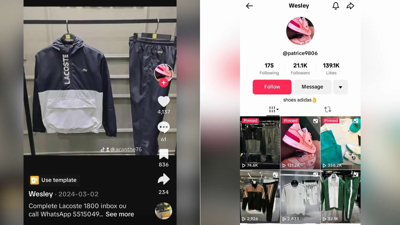 Effectivement, une visite sur ce profil confirme la vente de plusieurs produits, dont des survêtements très tendance de marques comme Lacoste, Hugo Boss, Adidas, ainsi que des chaussures des mêmes marques. Attiré par l’un de ces produits, le client a échangé des messages avec le Tiktokeur, confirmant ainsi sa commande. La livraison était prévue pour le lendemain.