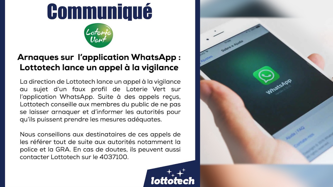 Lottotech, par le biais d’un communiqué émis ce mercredi 6 juillet, lance un appel à la vigilance du public à la suite d’un faux profil de Loterie Vert sur l’application WhatsApp. Cela suite à des appels que reçoivent des membres du public.
