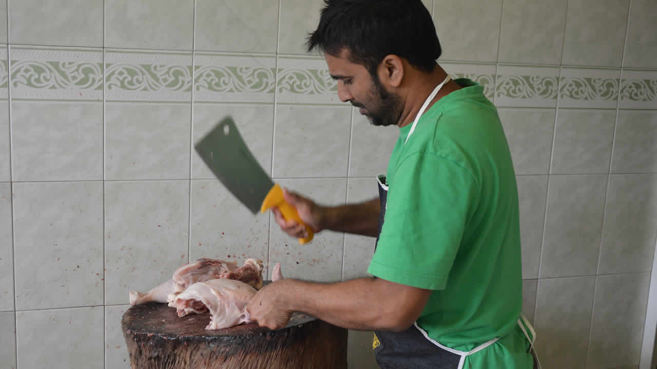Arshad découpe les poulets sur un gros billot tronc à l'aide d'un couteau chinois, à une vitesse qui donne froid dans le dos. Un simple moment d’inattention peut lui couper les doigts. Mais avec ses nombreuses années de pratique, on peut dire qu'il fait ce boulot les yeux fermés. À le voir à l’œuvre, on imagine qu'il aurait pu facilement prendre part à un concours de meilleur découpeur de poulet cru. Telle une machine, à chaque coup de couteau tombe un morceau de poulet de la même dimension. Une telle prouesse n'est pas donnée à tout le monde et il vaut mieux ne pas l’imiter.
