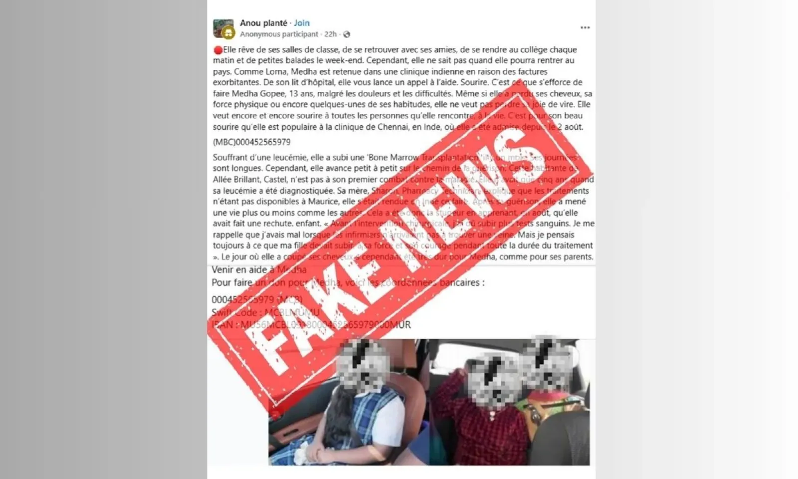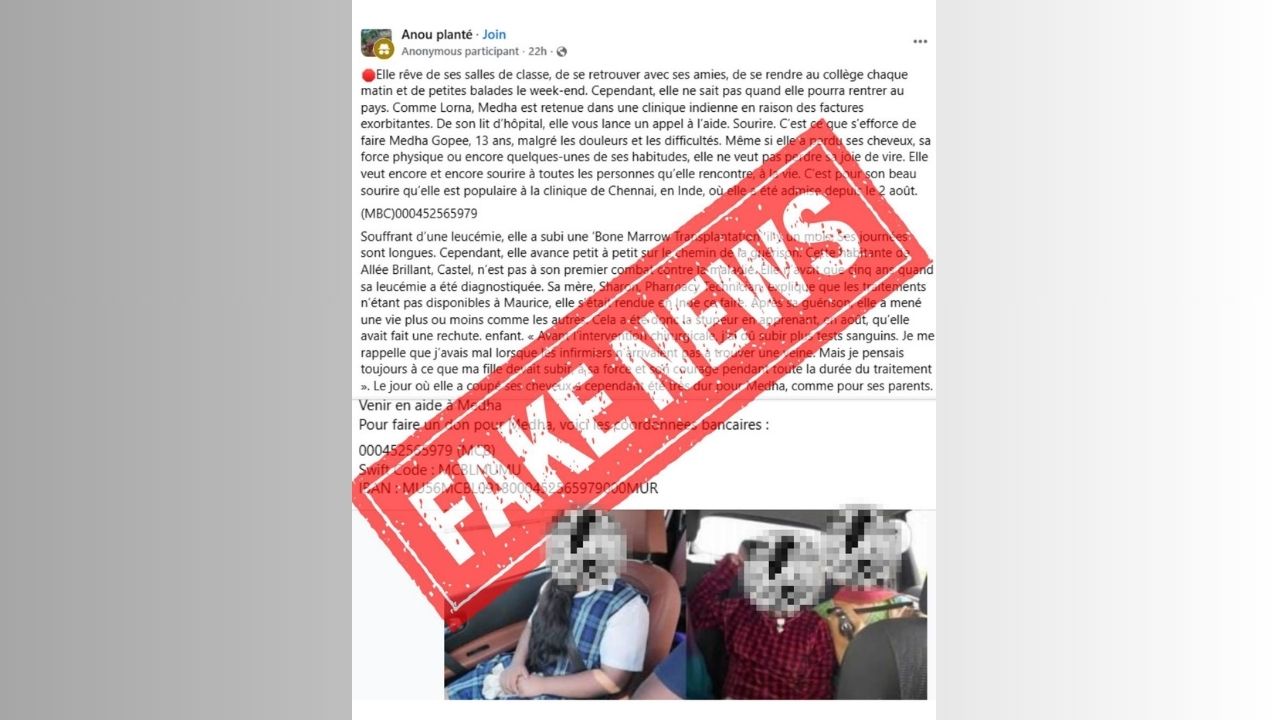 Un appel aux dons frauduleux circule actuellement sur Facebook au nom de Medha, 13 ans, atteinte de leucémie. L’auteur a repris un ancien article publié sur notre site le 6 septembre 2022 et y a ajouté un faux numéro de compte bancaire, dans le but de collecter illégalement de l’argent en utilisant notre logo.