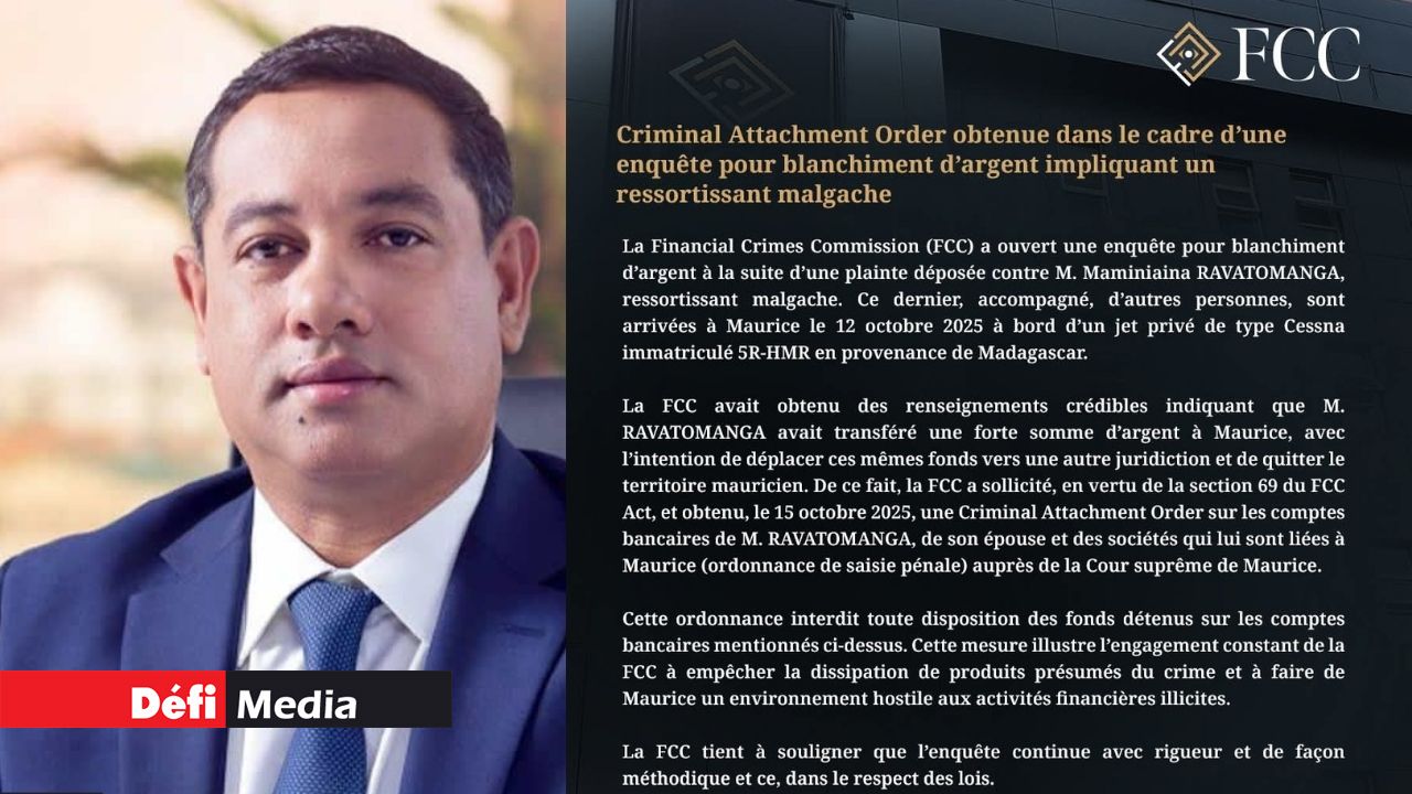D’après les informations dont dispose la FCC, Maminiaina Ravatomanga aurait transféré une importante somme d’argent vers Maurice, avec l’intention présumée de déplacer ces fonds vers une autre juridiction avant de quitter le territoire mauricien.
