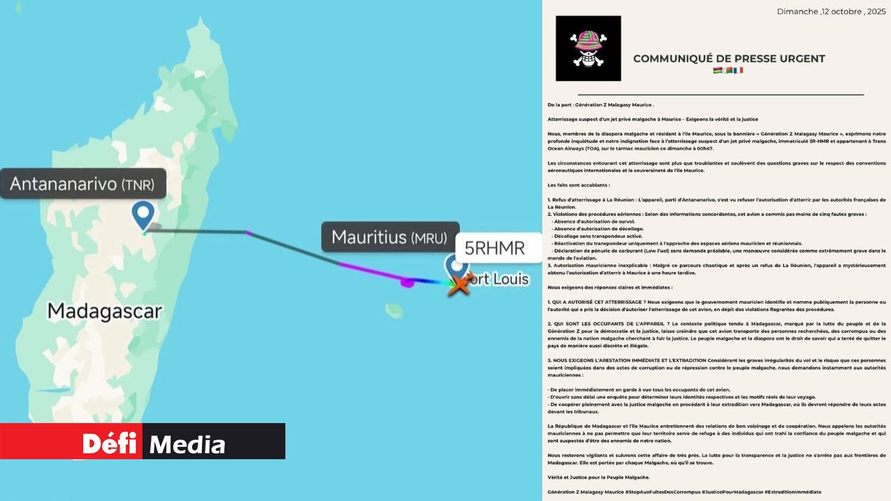 Dans un communiqué de presse émis ce dimanche 12 octobre, des membres de la diaspora malgache résidant à l’île Maurice, sous la bannière « Génération Z Malagasy Maurice », ont exprimé leur profonde inquiétude et leur indignation face à l’atterrissage suspect d’un jet privé malgache, immatriculé 5R-HMR et appartenant à Trans Ocean Airways (TOA), sur le tarmac mauricien ce dimanche à 00h47.