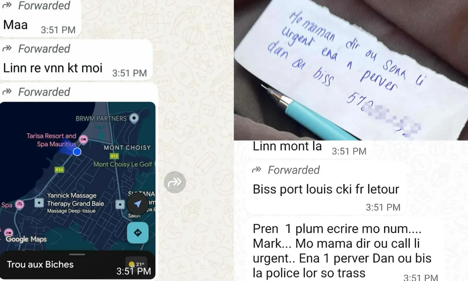 Cette fois, la collégienne ne s’est pas laissé faire. Discrètement, elle envoie des textos à sa mère pour l’informer de la présence de l’homme qui commet des attouchements. « Maa , linn revinn kot moi ». Elle envoie aussi la localisation en temps réel de l’autobus à sa mère. Et celle-ci, qui est sur son lieu de travail, réalise qu’elle ne pourra se déplacer jusqu’à cet autobus en mouvement. « Mo ti dans travaille Pointe-aux-Cannoniers et mo tifi so bus ti fini arrive Triolet. Li ti difficile pou mo alle rode ene taxi pou alle arrête sa bus la », confie-t-elle.