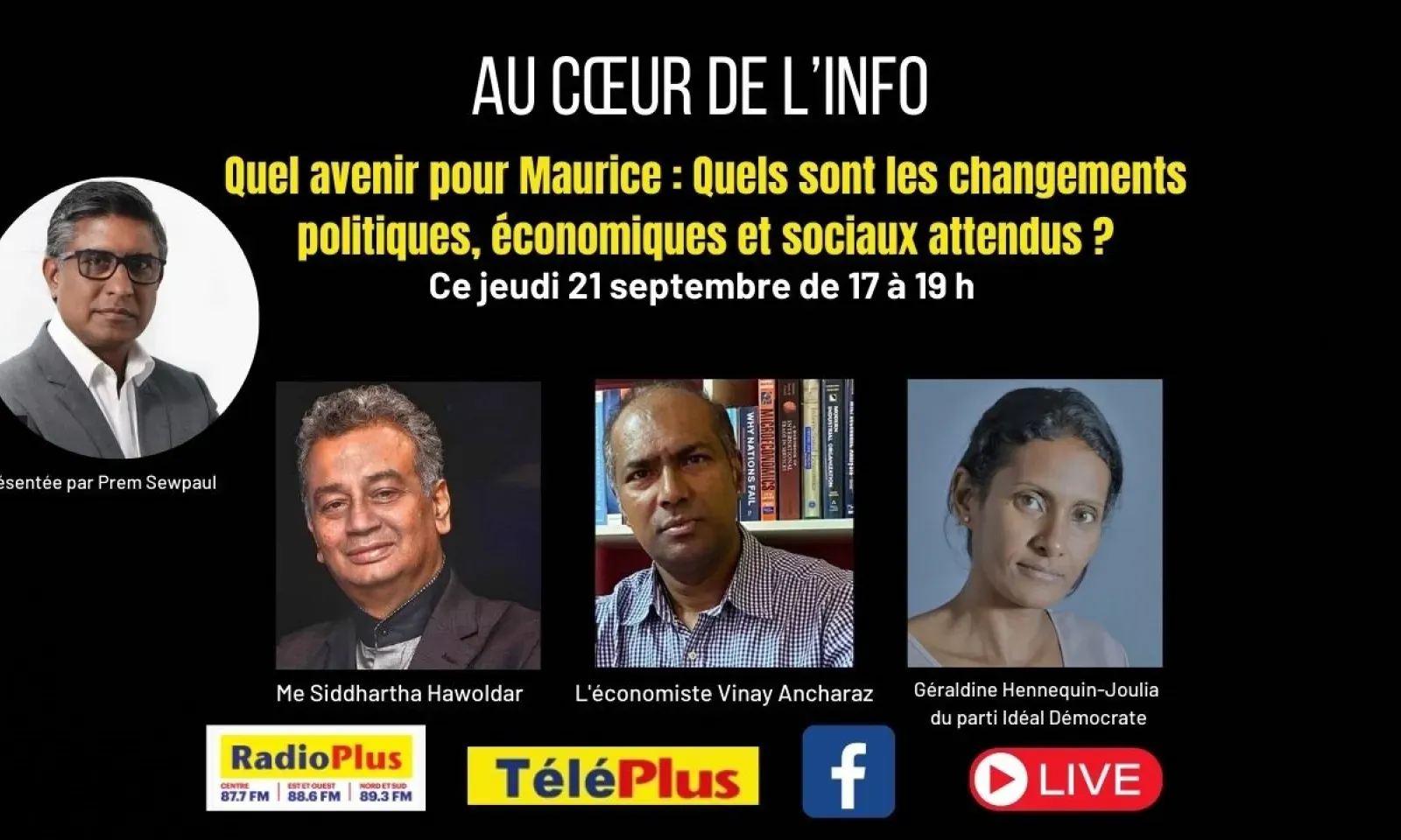 Prem Sewpaul sera rejoint sur le plateau par l'avocat Siddhartha Hawoldar, l'économiste Vinay Ancharaz et Géraldine Hennequin-Joulia du parti Idéal Démocrate.