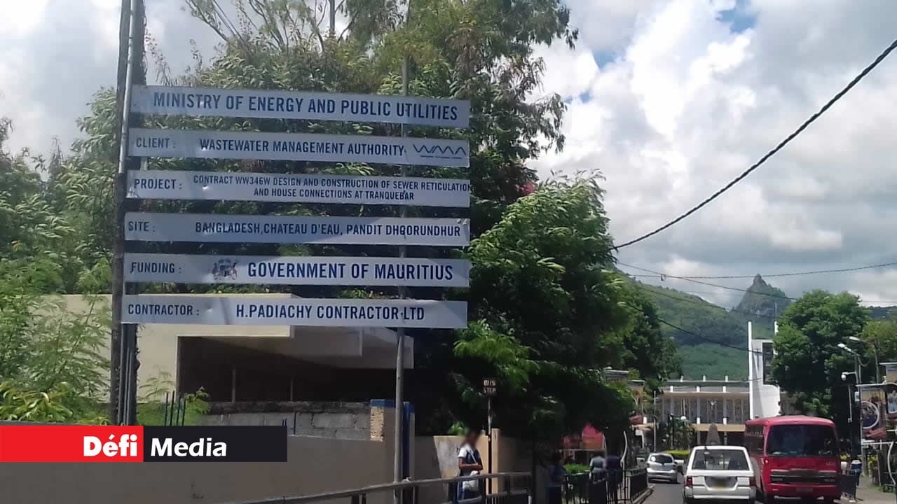 Le panneau fait mention des travaux pour le raccordement au tout-à-l’égout, un projet du ministère de l’Énergie et des Services publics à travers la Wastewater Management Authority.