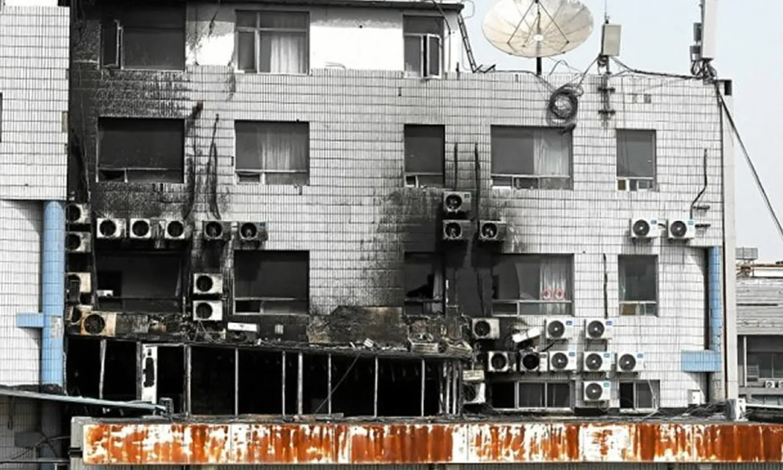 L'entrée principale du bâtiment semblait quasiment intacte de l'extérieur, mais des images de l'intérieur publiées par le média économique Caixin montrent des lits entièrement calcinés et des murs noircis.Sur une façade du complexe hospitalier, on aperçoit des fenêtres et des murs brunis par la suie, ainsi qu'une vitre cassée.