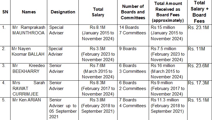 Il répondait à une question du député Kevin Lukeeram, portant sur les noms et les salaires de ces conseillers, ainsi que sur les conseils d’administration auxquels ils ont siégé entre 2015 et novembre 2024.