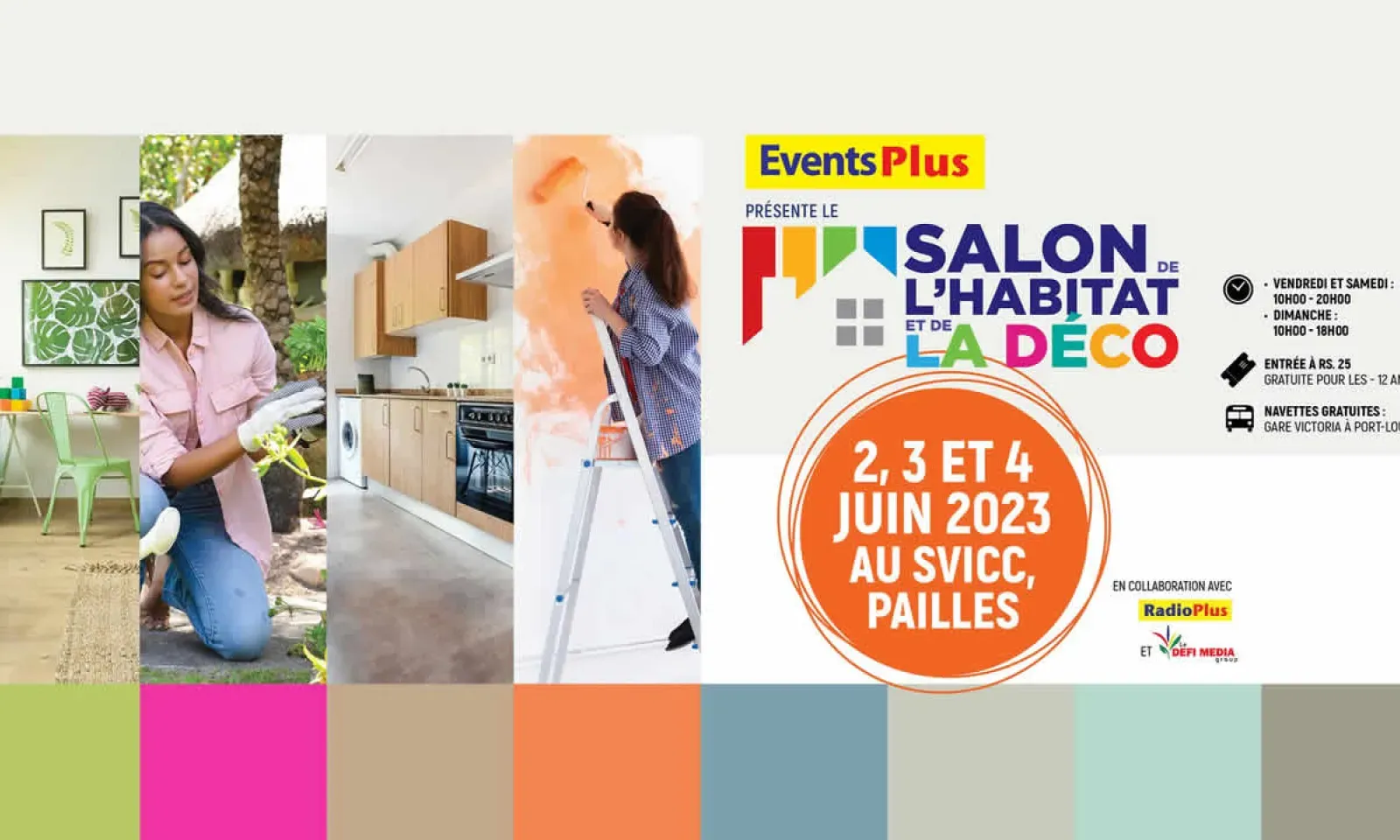 Le Salon de l’Habitat et de la Décoration, présenté par Events Plus en collaboration avec Radio Plus et Le Défimedia Group, sera ouvert le vendredi 2 et le samedi 3 juin de 10 heures à 20 heures. Le dimanche 4 juin, il accueillera les visiteurs de 10 heures à 18 heures. L’entrée est à Rs 25 pour les adultes et elle est gratuite pour les enfants de moins de 12 ans. Des navettes gratuites seront disponibles de la gare Victoria, à Port-Louis.