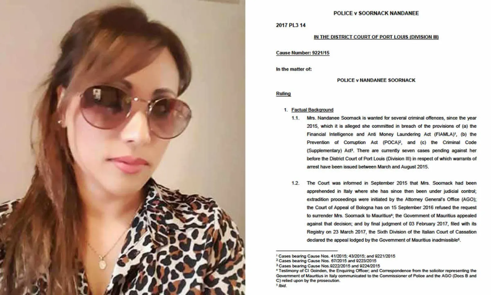 Nandanee Soornack avait quitté Maurice le 11 décembre 2014, le jour de la chute de Navin Ramgoolam du poste de Premier ministre, pour se réfugier en Italie. Elle est depuis recherchée dans sept affaires criminelles. C’est ainsi qu’elle faisait l’objet de sept mandats d’arrêt émis par le tribunal de Port-Louis.