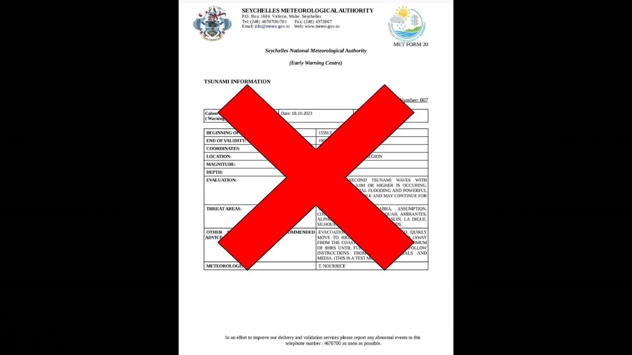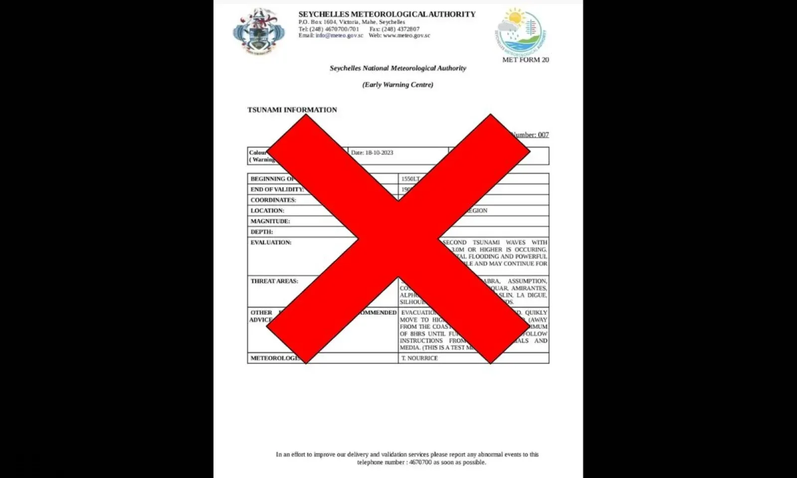« Fausse alerte au tsunami ! », affirme Seychelles Meteorological Authority après la circulation d'un document sur WhatsApp qui laisse entendre qu'une alerte au tsunami avait été émise ce mercredi 18 octobre. De nombreux Mauriciens ont reçu ce document portant l'en-tête de SMA via le service de messagerie WhatsApp, ce qui a suscité des inquiétudes étant donné que l'archipel se trouve à seulement 1 755 km de Maurice.