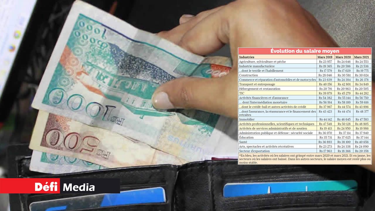 Entre mars 2020 et mars 2021, le salaire moyen a augmenté dans divers secteurs, notamment la manufacture, le secteur d’exportation, la santé, le commerce, le secteur financier ou encore l’immobilier. C’est dans le secteur des assurances que l’on enregistre la plus forte hausse du salaire moyen, qui est passé de Rs 44 474 à Rs 48 377. Cependant, au cours de la même période, il y a eu un recul dans le salaire moyen dans d’autres activités : le transport, les activités professionnelles ou encore le domaine administratif.
