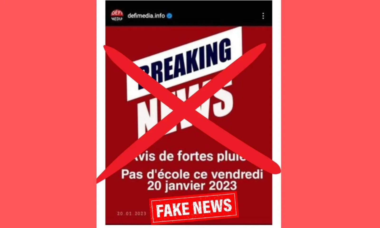 Il a été porté à notre connaissance, ce jeudi 19 janvier, qu’un post portant le logo du Défi Media circule sur les réseaux sociaux depuis cet après-midi faisant accroire qu’il n’y aura pas de classes ce vendredi 20 janvier. Le/les auteur/s de cette «fake news» a/ont modifié la date d’un post publié ce matin sur nos plateformes numériques pour annoncer qu’il n’y aura pas d’école ce jeudi 19 janvier 2023. La date du jeudi 19 janvier 2023 a été remplacée par celle du vendredi 20 janvier 2023. www.defimedia.info n’a jamais annoncé qu’il n’y aura pas de classes ce vendredi. D’ailleurs, le ministère de l’Éducation n’a émis aucun communiqué officiel en ce sens. C’est ce vendredi matin 20 janvier que le ministère fera savoir si les classes reprendront ou pas.