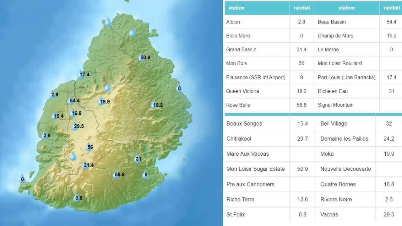 Avec 58.8 mm de pluie, Rose-Belle est la région la plus arrosée durant les dernières 24 heures (entre 4 h du matin jeudi et 4 h ce vendredi) suivie de Beau-Bassin (54,4 mm). Ces chiffres sont fournis par la station météorologique de Vacoas.