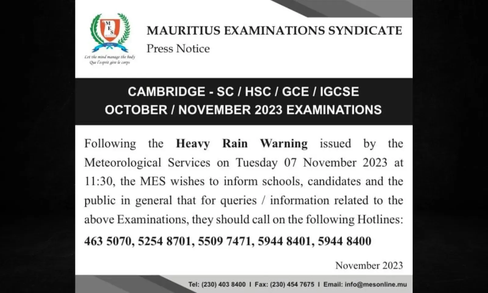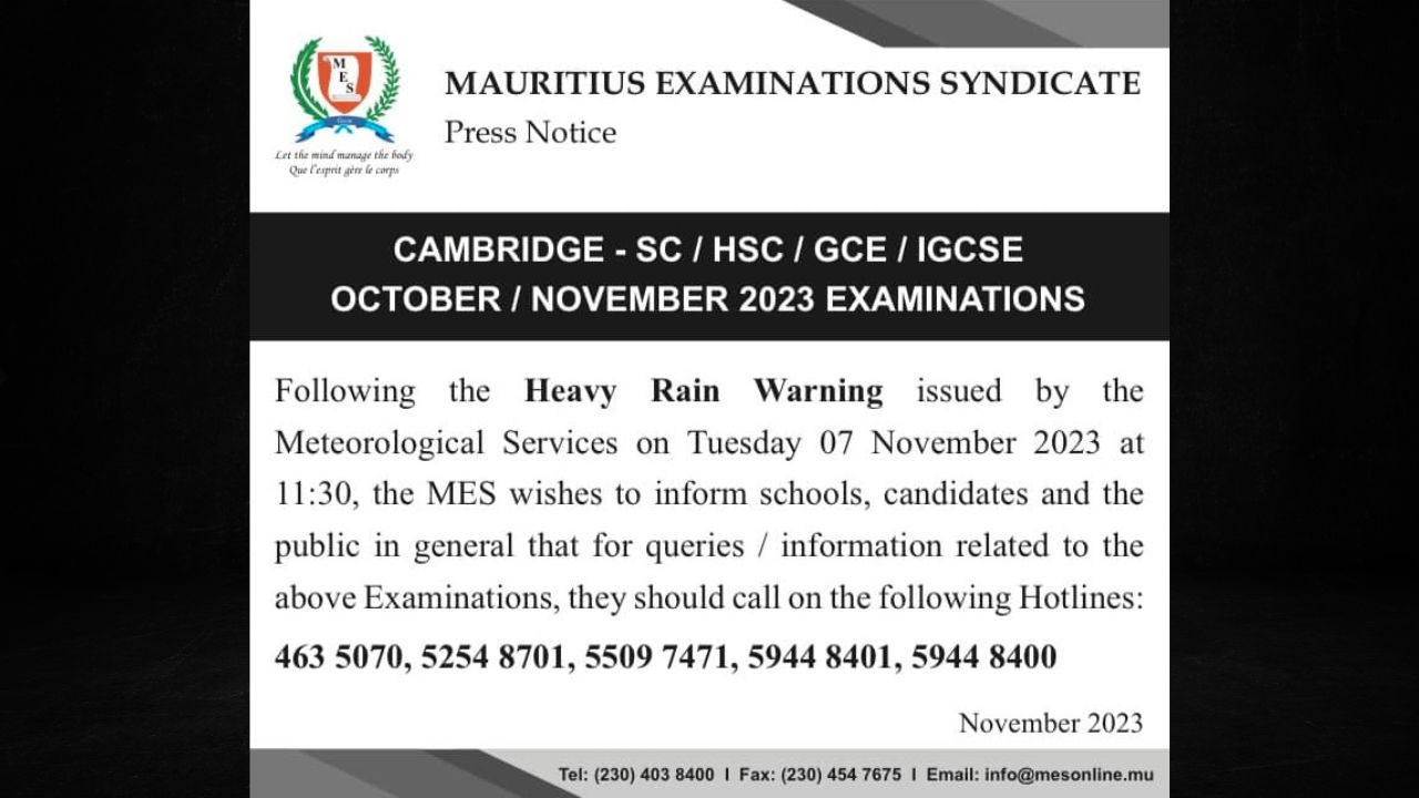 À la suite de l'alerte aux fortes pluies émise par les services météorologiques ce mardi, le MES souhaite informer les écoles, les candidats et le public en général que pour toute question/information relative aux examens (SC, HSC, GCE et GCSE), ils doivent appeler les numéros d'urgence suivants : 463 5070, 5254 8701, 5509 7471, 59448401 et 5 944 8400.