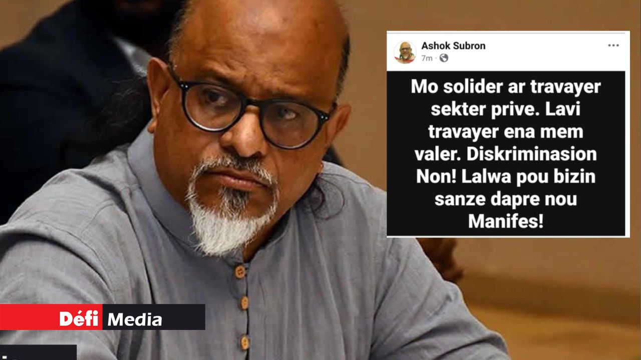 Sur sa page Facebook, Ashok Subron, ministre de l’Intégration sociale, de la Sécurité sociale et de la Solidarité nationale, a indiqué « Mo solider ar travayer sekter prive. Lavi travayer ena mem valer. » Il a exprimé son opposition à toute forme de discrimination et a précisé que la loi devra être modifiée, comme mentionné dans le manifeste électoral de l’Alliance du Changement.