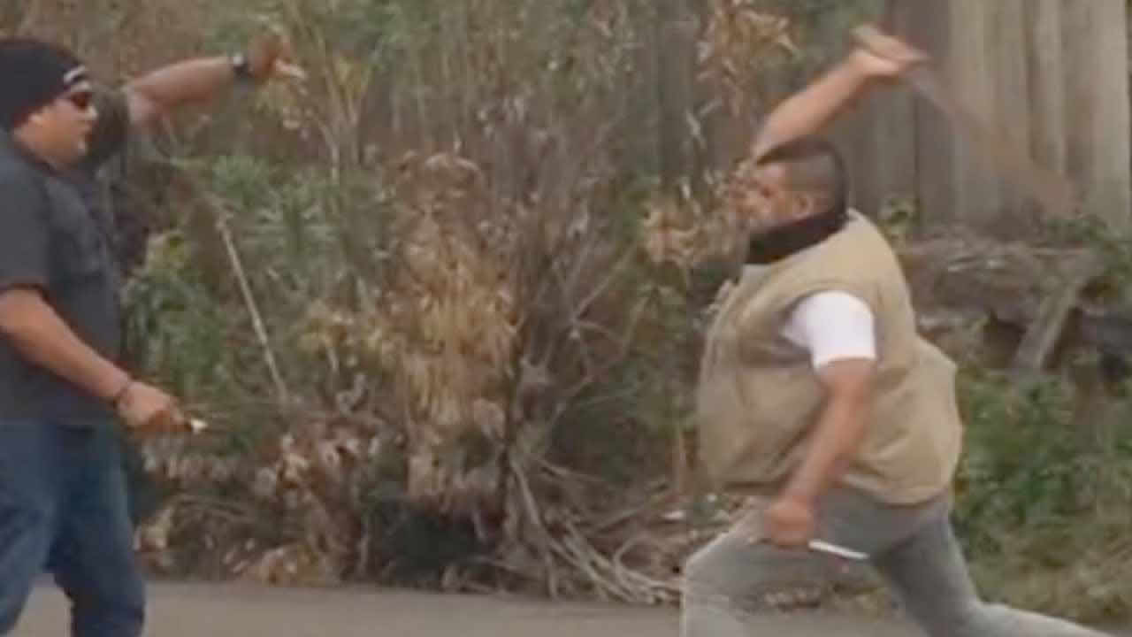 Toute la scène a été filmée. Dans la vidéo, on voit deux hommes, dont l’un était armé d’un sabre et d’un couteau, en venir aux mains. On peut aussi y apercevoir deux motards de la police qui traversaient la région. Ils ne se sont pas arrêtés.