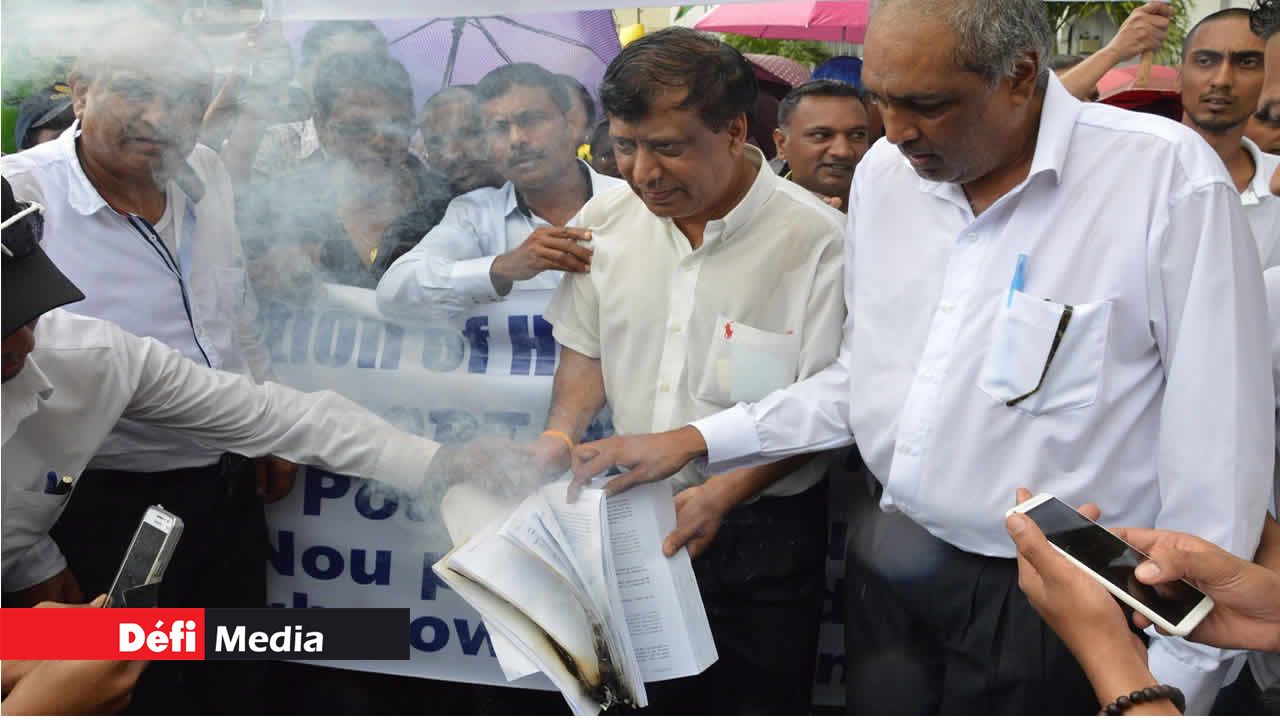 Des membres de la Federation of Health Services Union ont brûlé une copie du rapport du Pay Research Bureau (PRB) 2016 lors d’une marche de protestation mercredi 20 avril à Port-Louis.