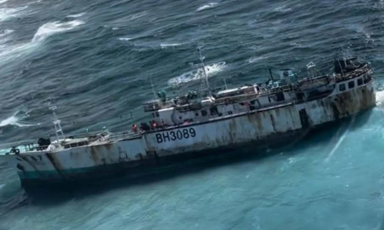 Environ 80 tonnes d’appâts ont été jetés à l’eau pour réduire le poids du bateau, sauf que ce faisant, cela a attiré des requins. Ce qui compliquera sans nul doute les opérations autour du chalutier.