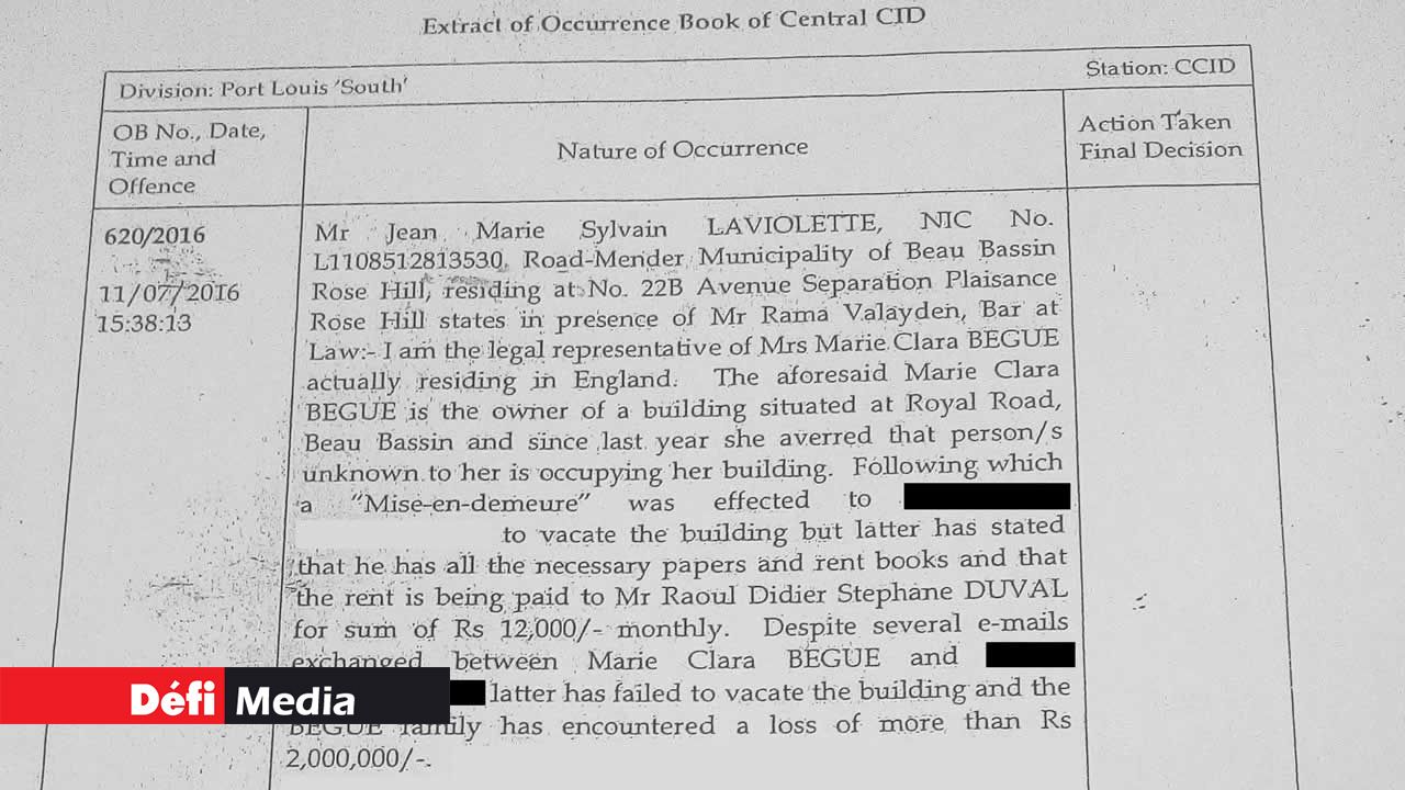 Le locataire a insisté qu’il était un occupant légal et qu’il possédait tous les documents nécessaires et que le rent book qui prouve que le paiement du loyer est effectué à l’ordre d’un certain Raoul Duval, à raison de Rs 12 000 par mois.